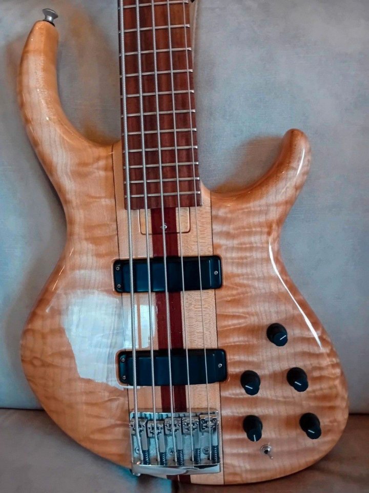 Beautiful 5 string Tobias with the original case. Its a 1990 basic 5 with quilted maple bodywings and from factory ordered wooden covers wich were not standard on this bass at the time. Serialnumber 1273.