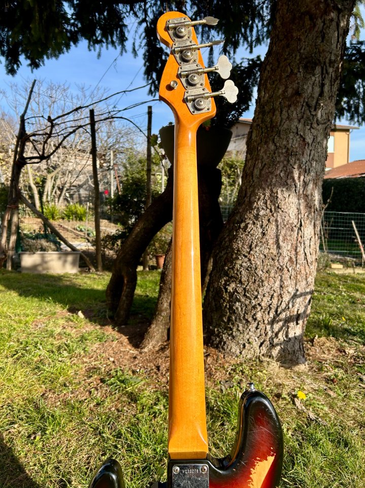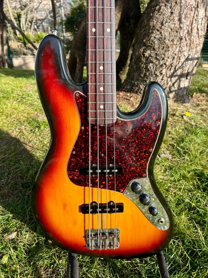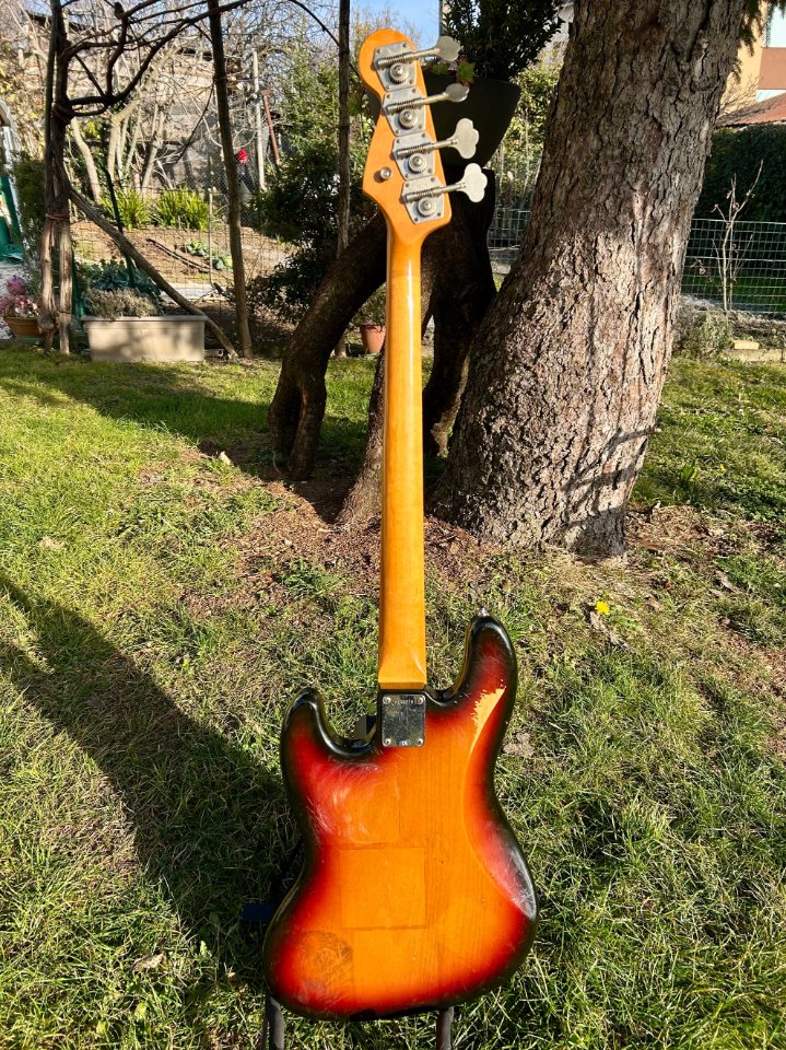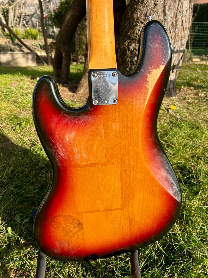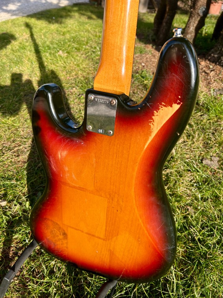 In good condition, plays well, with no defects to report, except for a few cosmetic blemishes on the back of the body resulting from wear and stickers left on the bass for too many years.