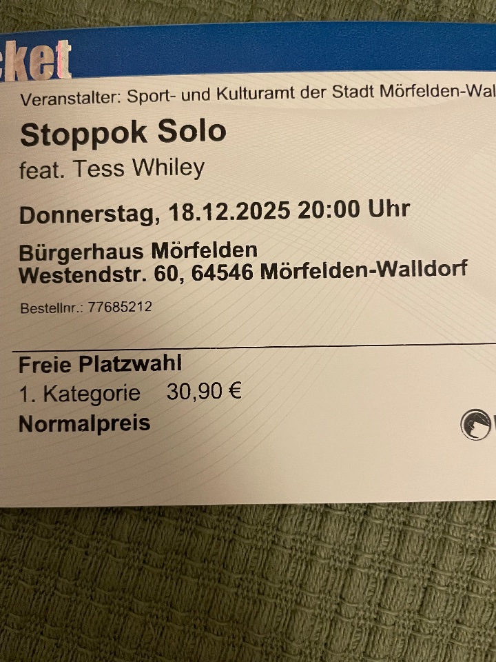 ich hab zwei Karten für das Stoppok Konzert am 18. Dezember in Mörfelden-Walldorf abzugeben.
