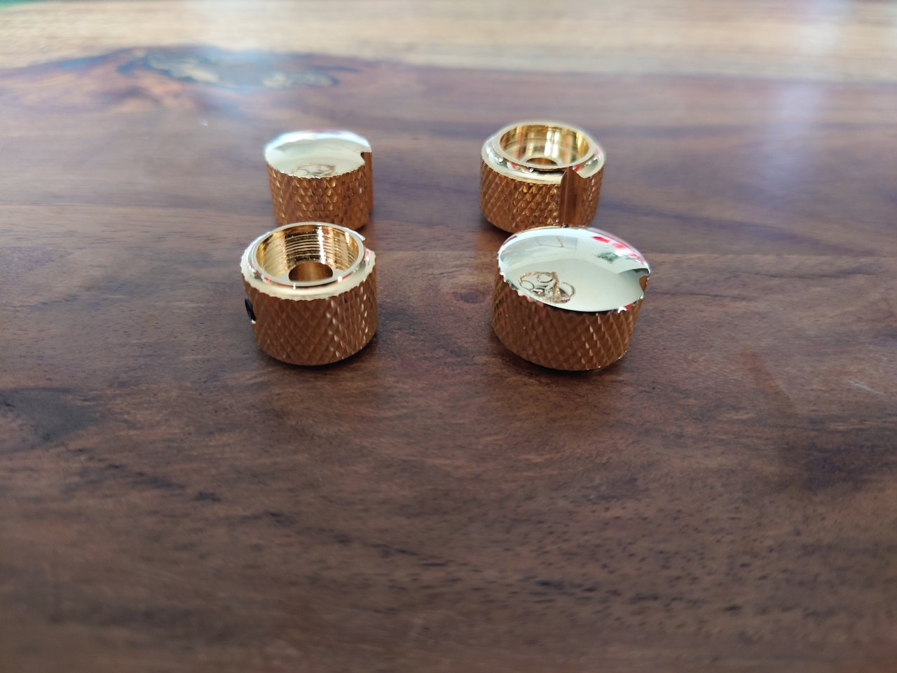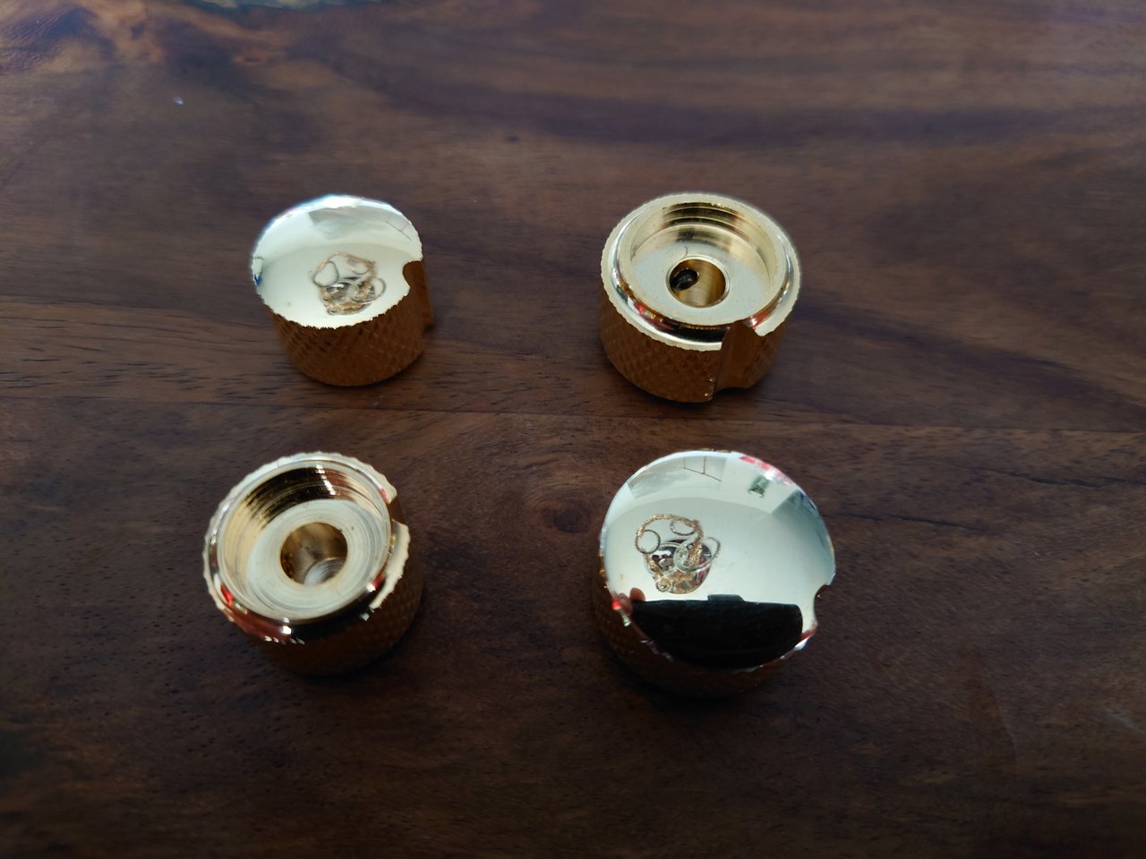 Verkaufe 4 neuwertige Potiknöpfe, massives Messing vergoldet, für 6mm-Achsen. Serie Göldo Deluxe, im Design mal was anderes...