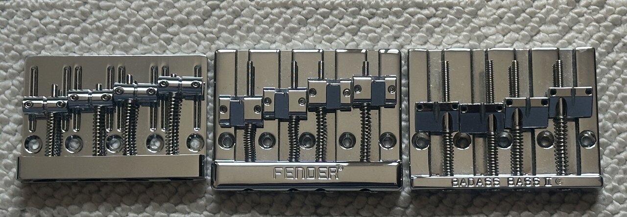 Passt auf alle Jazz und P-Bässe (z.B. Fender/Squier/Ibanez) mit 5 Befestigungslöchern und ist etwas kürzer als eine Fender HiMass oder Badass II (Vergleichsbild). Sie ist mit ca. 150g auch etwas leichter als diese beiden, aber doch schwerer als die einfachen Blechwinkelbrücken.