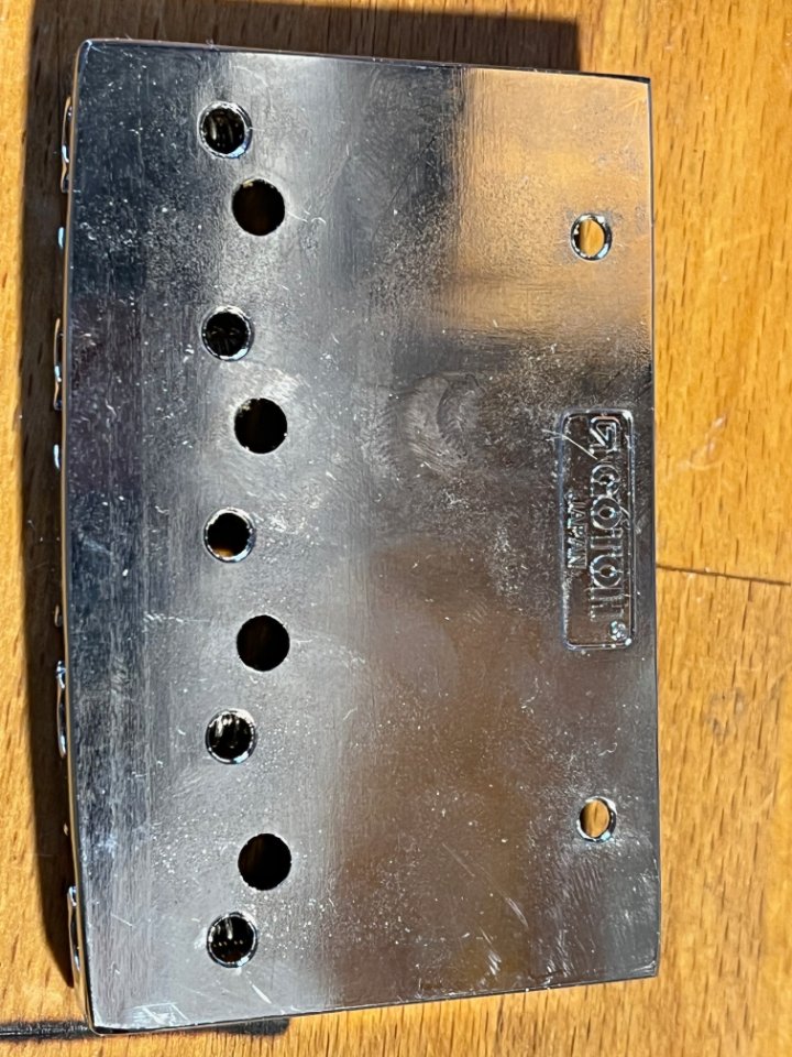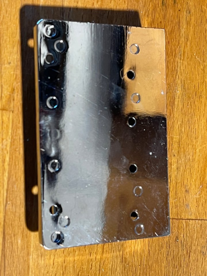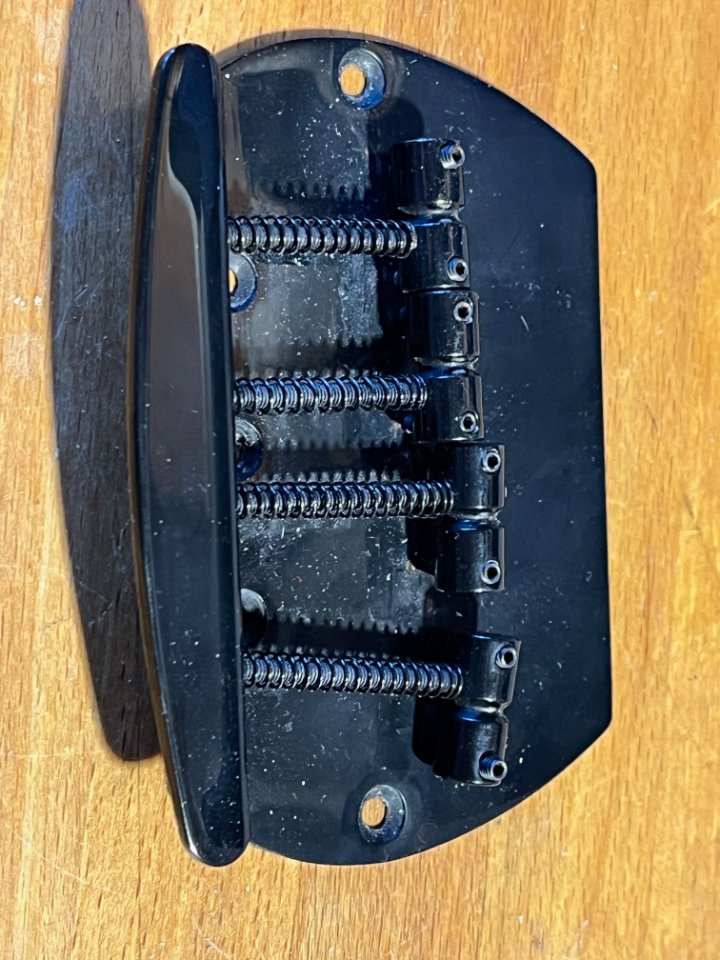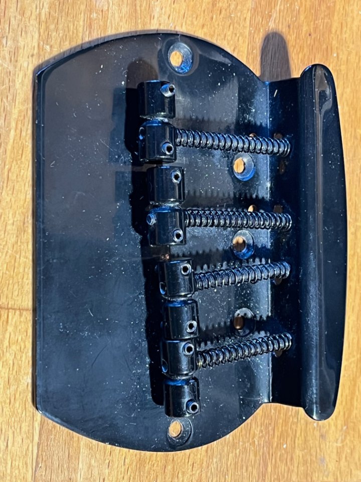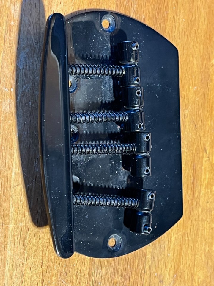 - NoName Blechwinkel ähnlich MusicMan bzw. billige SBMM oder Lakland, Schwarzverchromt, Material vermute ich Stahlblech, das auf dem Bild zu sehende Kupfer ist eher Basis für die Schwarzverchromung, Spacing 19mm (ca.) Bohrungen zum Durchfädeln durch die Brücke oder durch den Body. Hier für €10,- zzgl. P&P