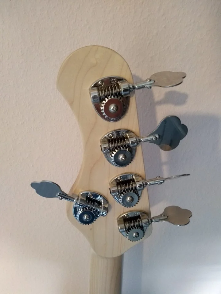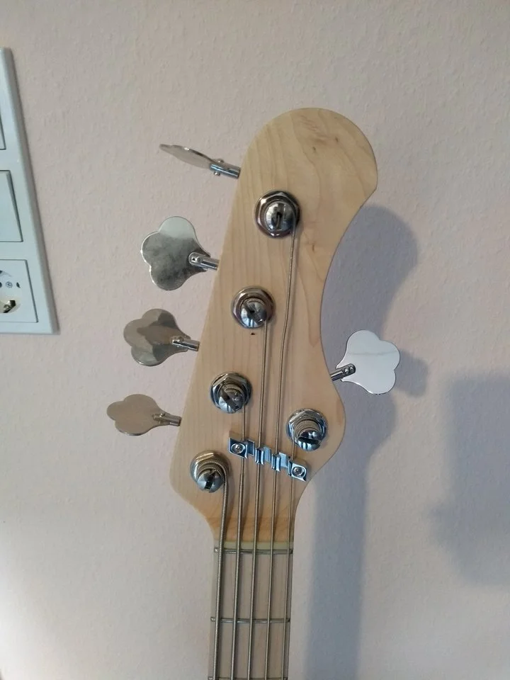 Der Mahagony Korpus stammt von Bassline, der sehr gute Hals (Hat alleine über 400 Euro gekostet) ebenfalls, die Elektronik von Noll, die Ultra Light Mechaniken von Sandberg. Alles in allem ein gut aussehendes, super bespielbares Instrument. Der Humbucker ist splitbar, Aktiv/Passivschaltung ist vorhanden.