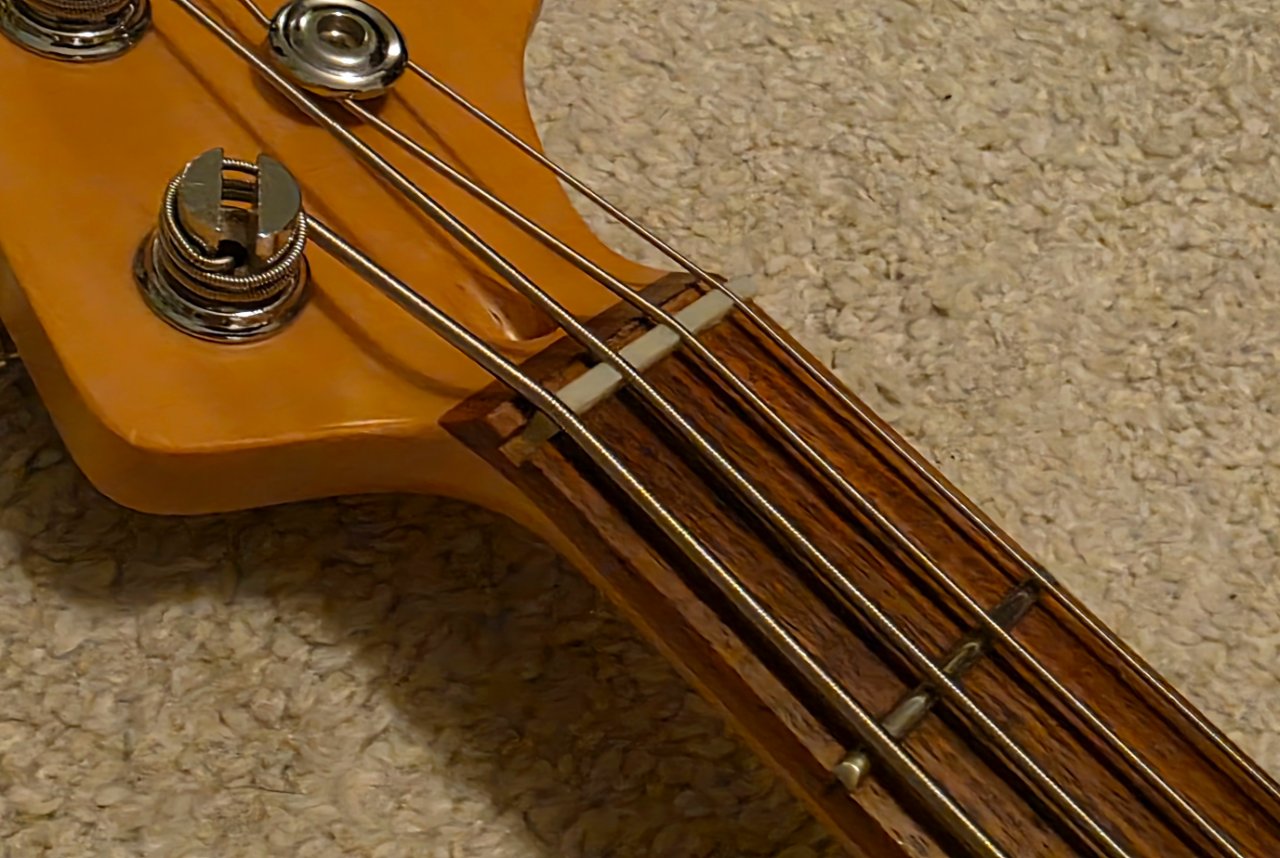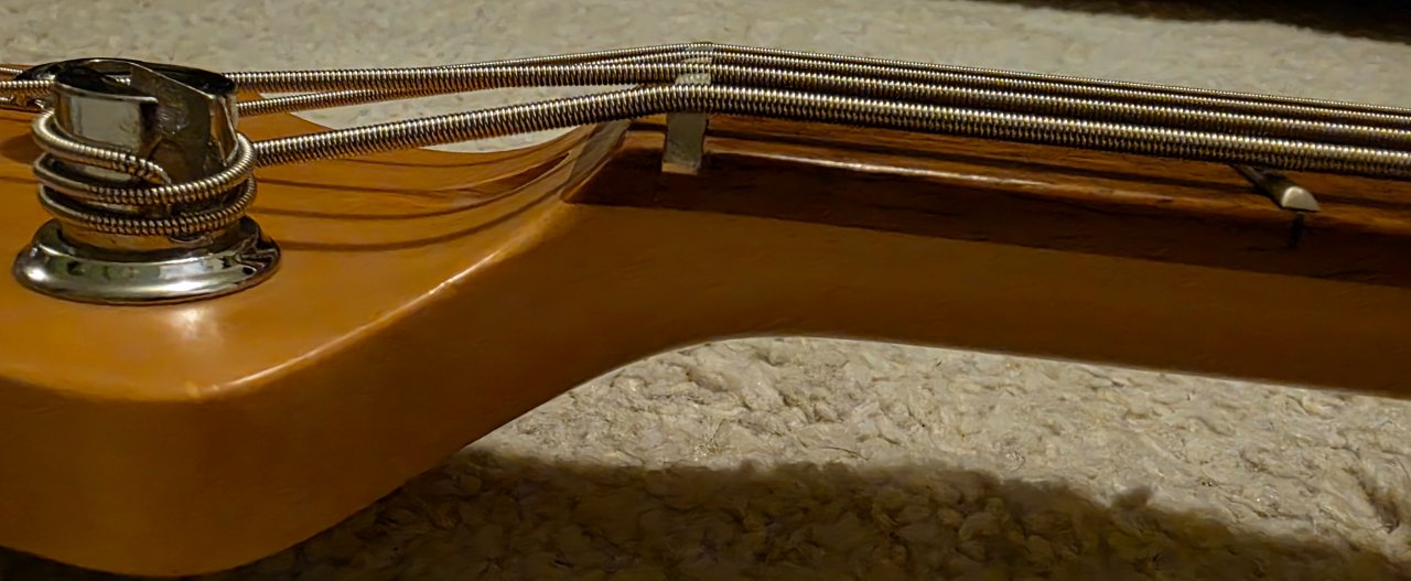 Der Sattel ist gebrochen, aber die E-Saite liegt noch auf und ist spielbereit (siehe Foto). Ein neuer Sattel (42mm, Preci-Standard) sollte aber irgendwann mal rein.