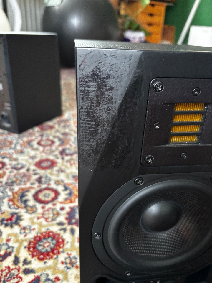 Die Monitore/ Subwoofer funktionieren einwandfrei und befinden sich in einem sehr guten, gebrauchten Zustand. Ein paar kleinere, zu vernachlässigende Gebrauchsspuren sind natürlich vorhanden.Der Subwoofer hat vor ca anderthalb Jahren eine neue Endstufe von Adam Audio eingebaut bekommen und ist somit fast neu. Einer der Monitore weist leider eine unschöne Stelle oben links auf. Siehe Fotos. Hier war ein Aufkleber von Musik Produktiv angebracht, der sich leider in das Oberflächenmaterial eingefressen hat. Dieser Makel lies sich leider nicht besser entfernen. Ist nicht schlimm, sieht nur nicht so gut aus.