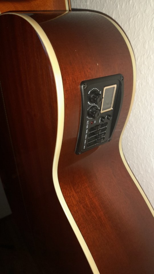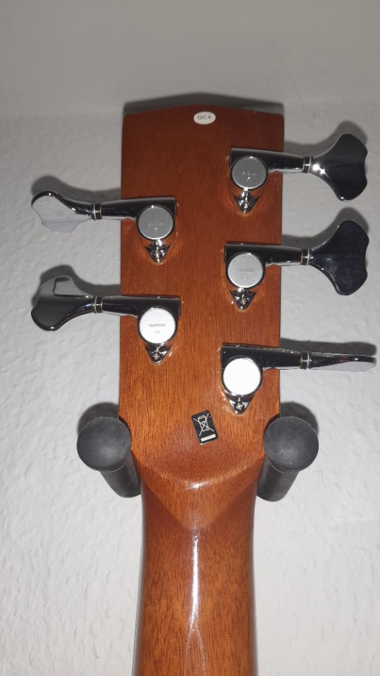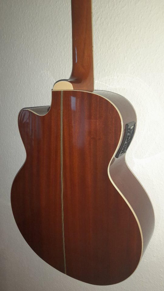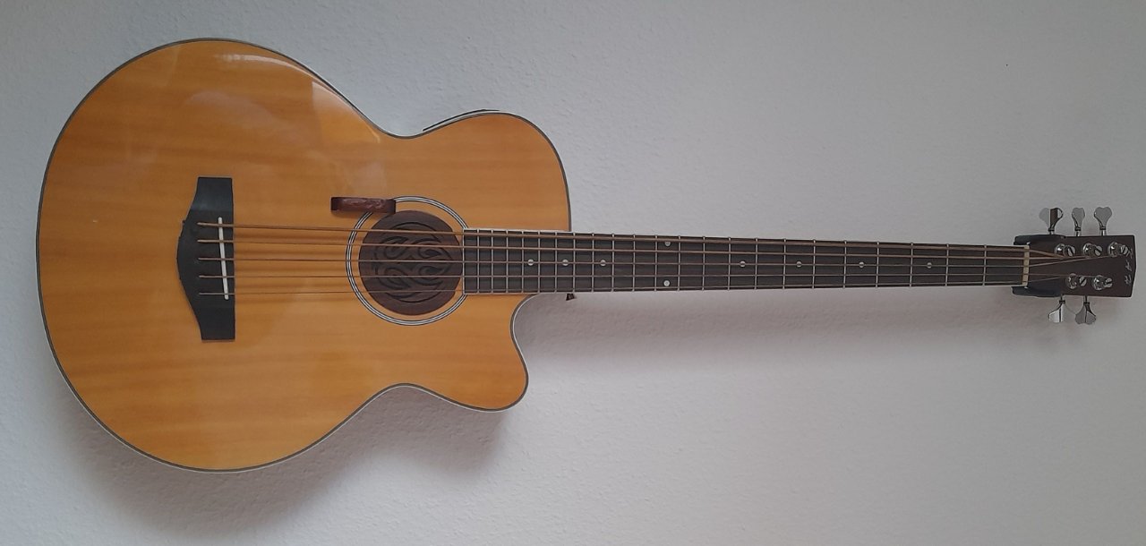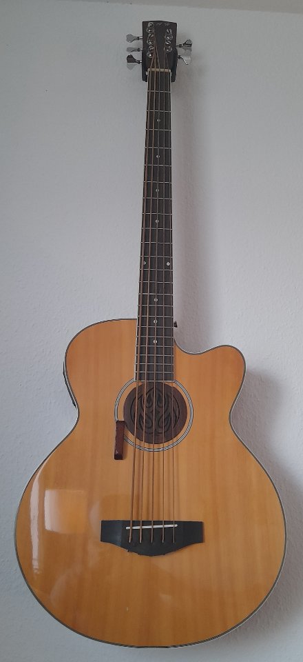 Harley Benton B-35NT Acoustic Bass Series. Super Jumbo 5-saitig Cutaway Style, Fichten Decke, Sapele Mahagoni (Entandrophragma cylindricum) Boden und Zargen und Hals. Customized von Gitarrenbauer Karsten Helmers K A H. Saitenlage eingestellt, Knochensattel montiert, Daumenablage angebracht und Bünde abgerichtet. Neue Gotoh-Mechaniken montiert. Inkl. extra Schallochabdeckung.
