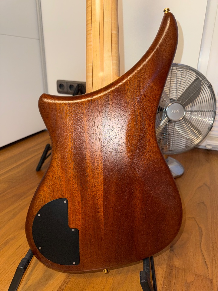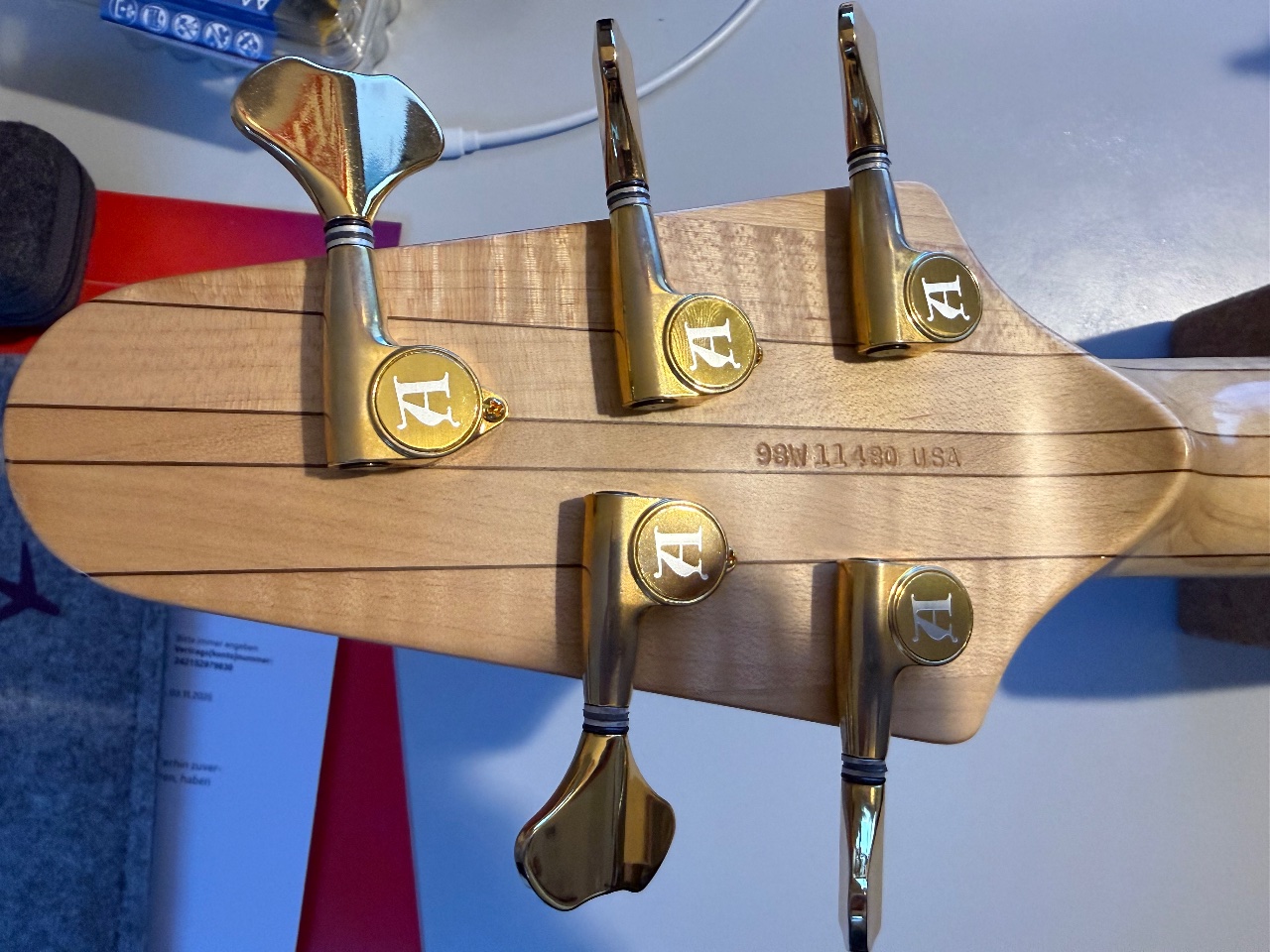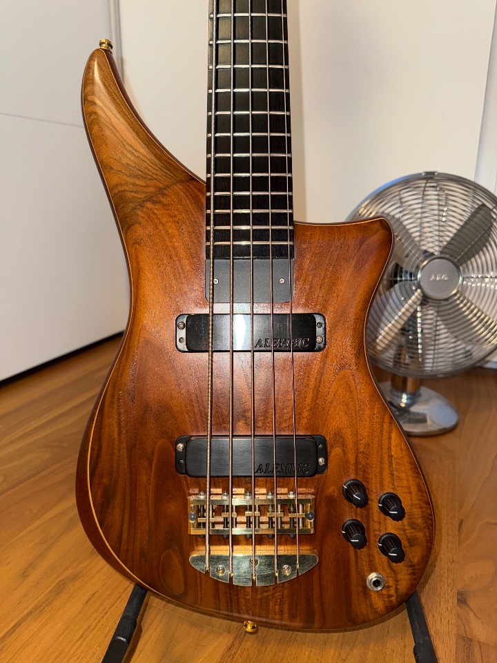 Biete hier meinen Alembic Epic 5 zum Verkauf an. Der Bass ist in ganz ausgezeichnetem Zustand, bis auf eine winzige Stelle an der Kopfplatte und eine kleine Delle an der Zarge. Griffbrett, Bünde Oberflächen - alles sauber. Der Bass hat gerade einen Service bekommen und die Saitenreiter wurden erneuert (original Alembic). Der Epic hat im Gegensatz vielen Alembics eine einfache Elektronik: Volumen, Pan, Bass, Treble - fertig. Der Klang ist herausragend. Unfassbar sattes Fundament, sehr klare Höhen. Und da rauscht nichts, auch nicht bei voll aufgedrehten Höhen. Die Holzkombination aus Walnuss und Mahagoni mit Trennfurnier gehört für mich zum Schönstem, was man so auswählen kann. Antesten in Mülheim unter Studiobedingungen oder auch mit großem Besteck ist jederzeit möglich.