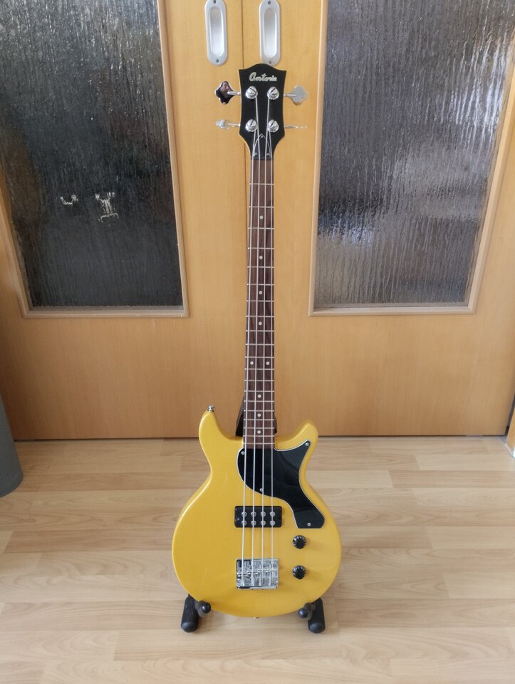 Antoria New Yorker Bass, 30" Short Scale in TV Yellow. Offensichtlich eine Gibson DC Les Paul Junior Kopie.