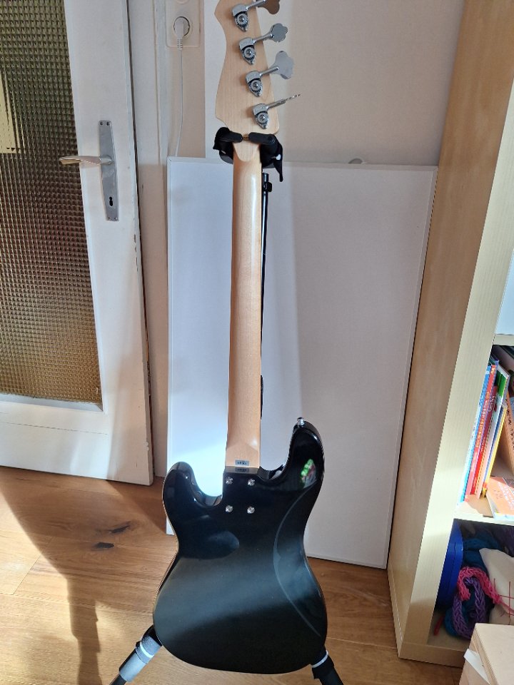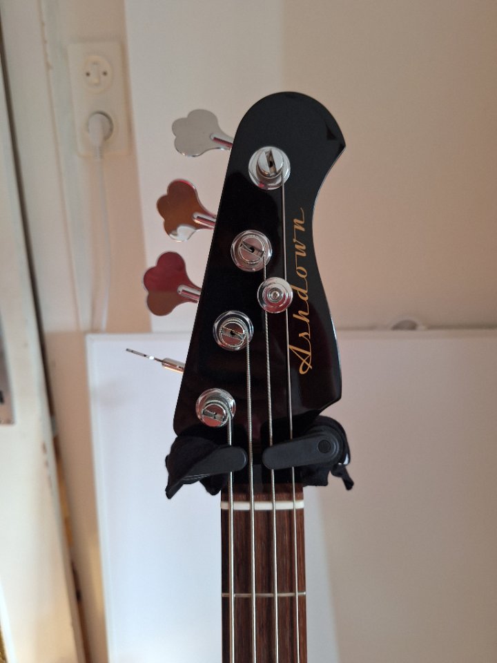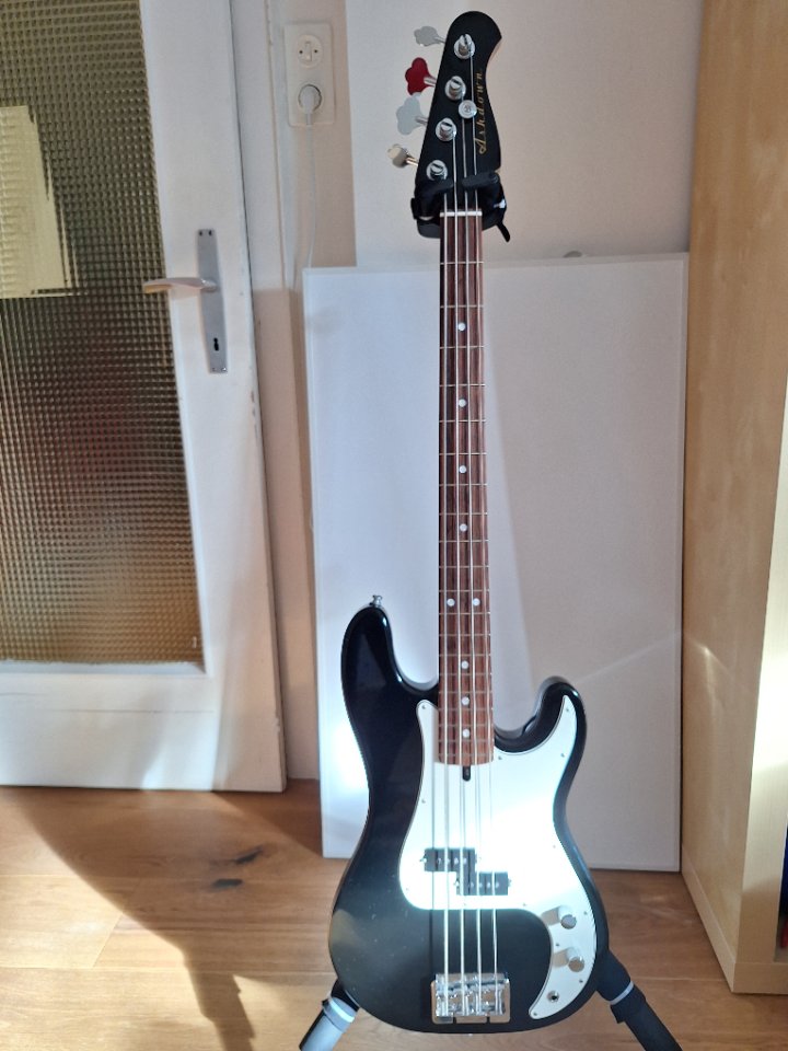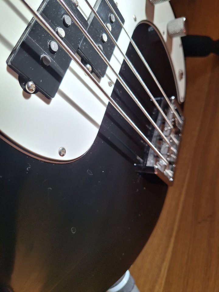 Ich habe Ihm einen Fender CS 62 Tonabnehmer und eine Hipshot Himass Brücke spendiert. Beides steht Ihm gut und trotz der recht massiven Brücke kommt er auf 3,9kg. Hängt gut ausbalanziert am Gurt. Der Hals fühlt sich sehr geschmeidig am da er nicht lakiert sondern gewachst und geölt wurde, wie D Lakin das gerne mache bei seinen Bässen, der hat die Serie übrigenz co designt.