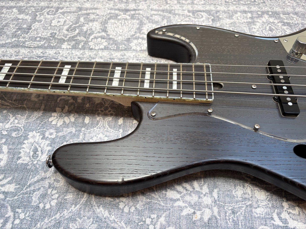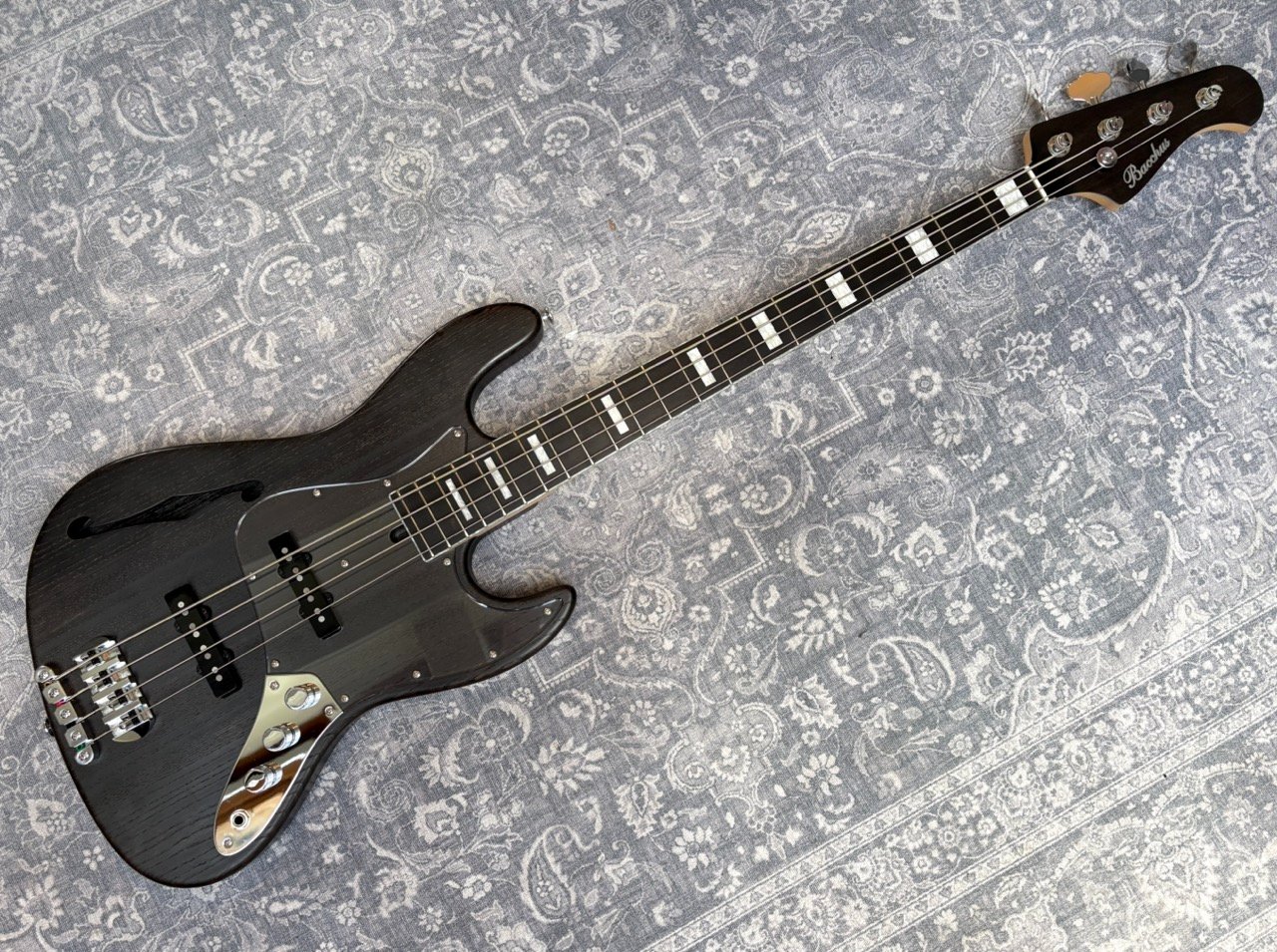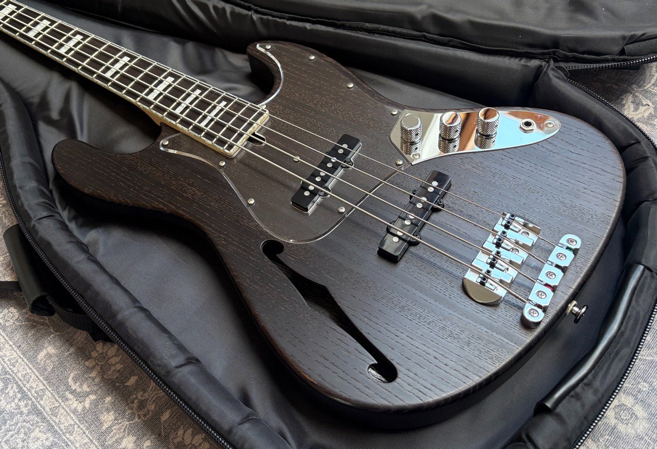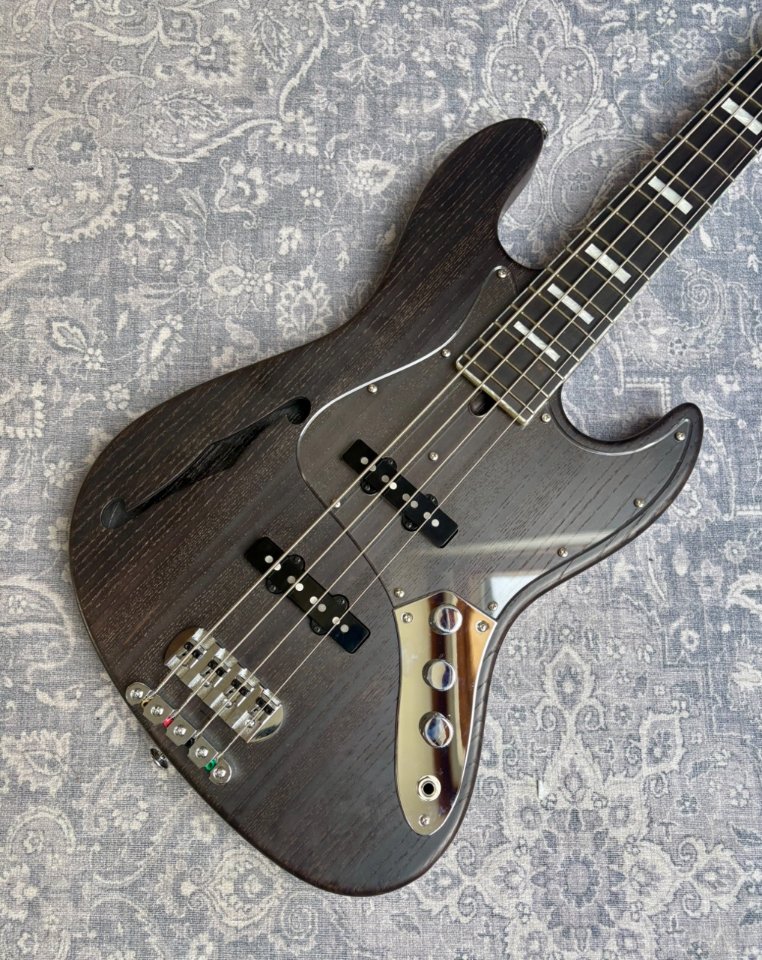 High-end Jazz Bass from the Japanese brand Bacchus, built in 2010. It is a passive bass built from light ash, with an ebony fretboard with pearl block inlays and pearl binding. It has high quality Gotoh hardware and is very light at 3,9 kilos.