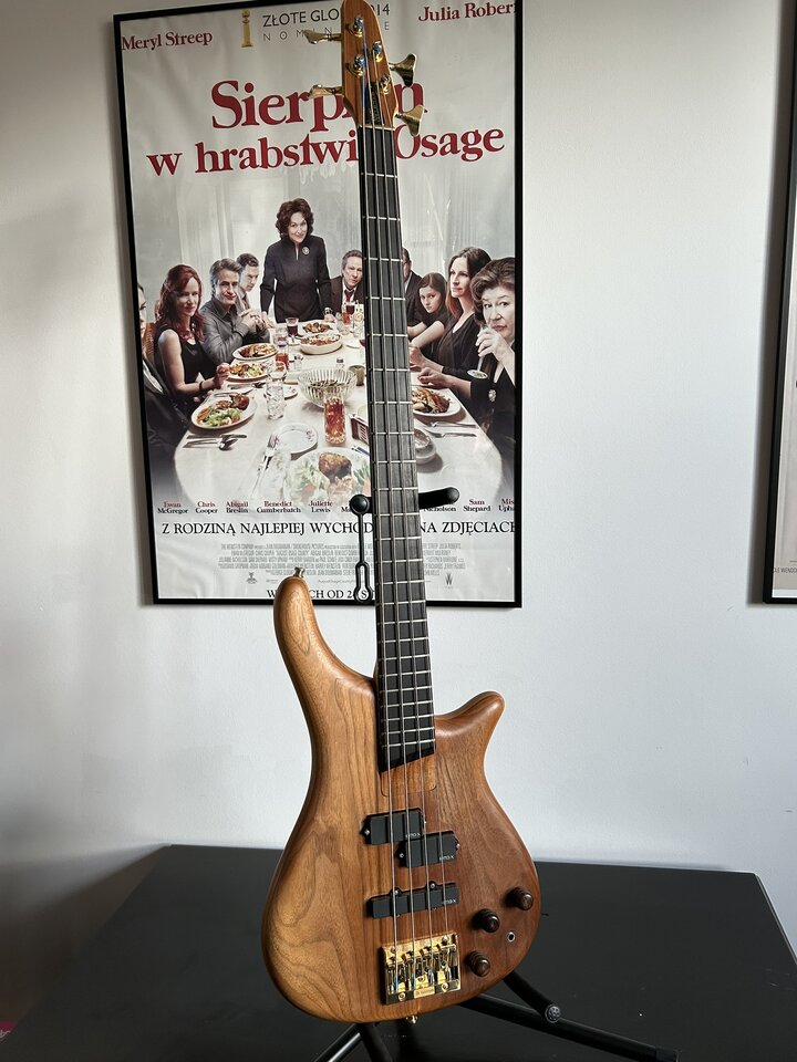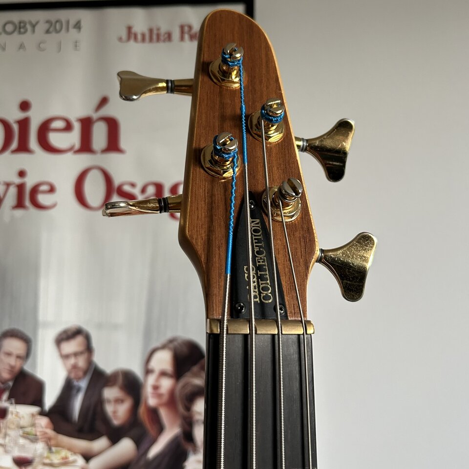 I rate the condition as good with a big plus - the bass has slight abrasions from thumb and slapping, but apart from that it looks great. The hardware is still gold, the frets have only slight marks, and we will not find any bruises on the body. The "scar" visible near the upper corner is not damage, but a natural mark on the wood. The trussrod works perfectly, the action is set below 1.5 mm above the 12th fret.