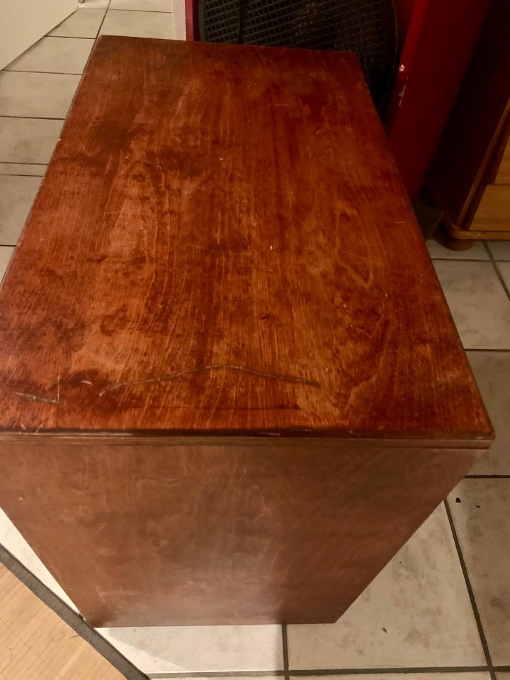 Stabile, sehr solide Bauweise , vermutlich Multiplex furniert...? Hat leider einige Kratzer.