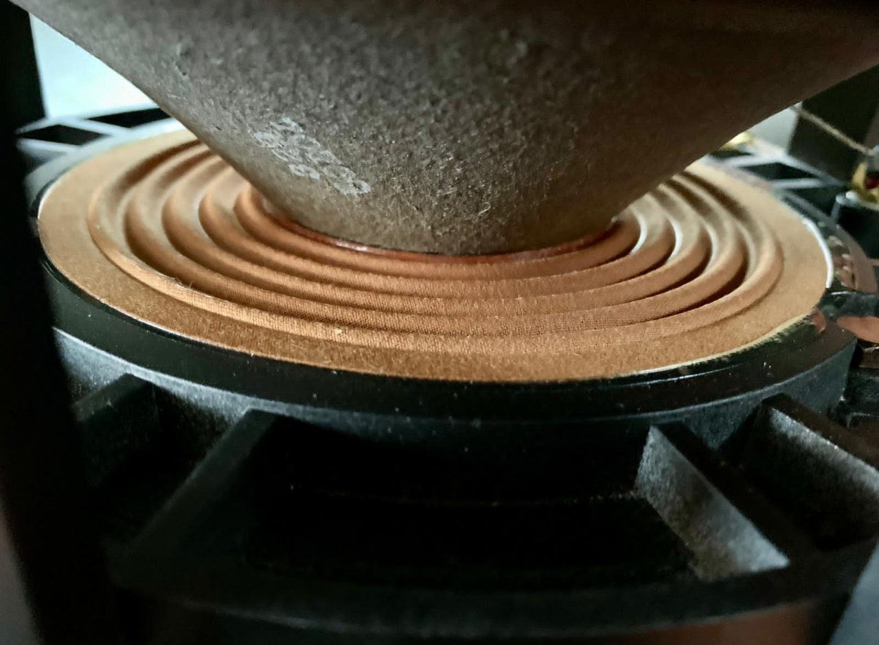Die Staubschutz Kalotte des Lautsprechers oben rechts hat eine kleine Delle.