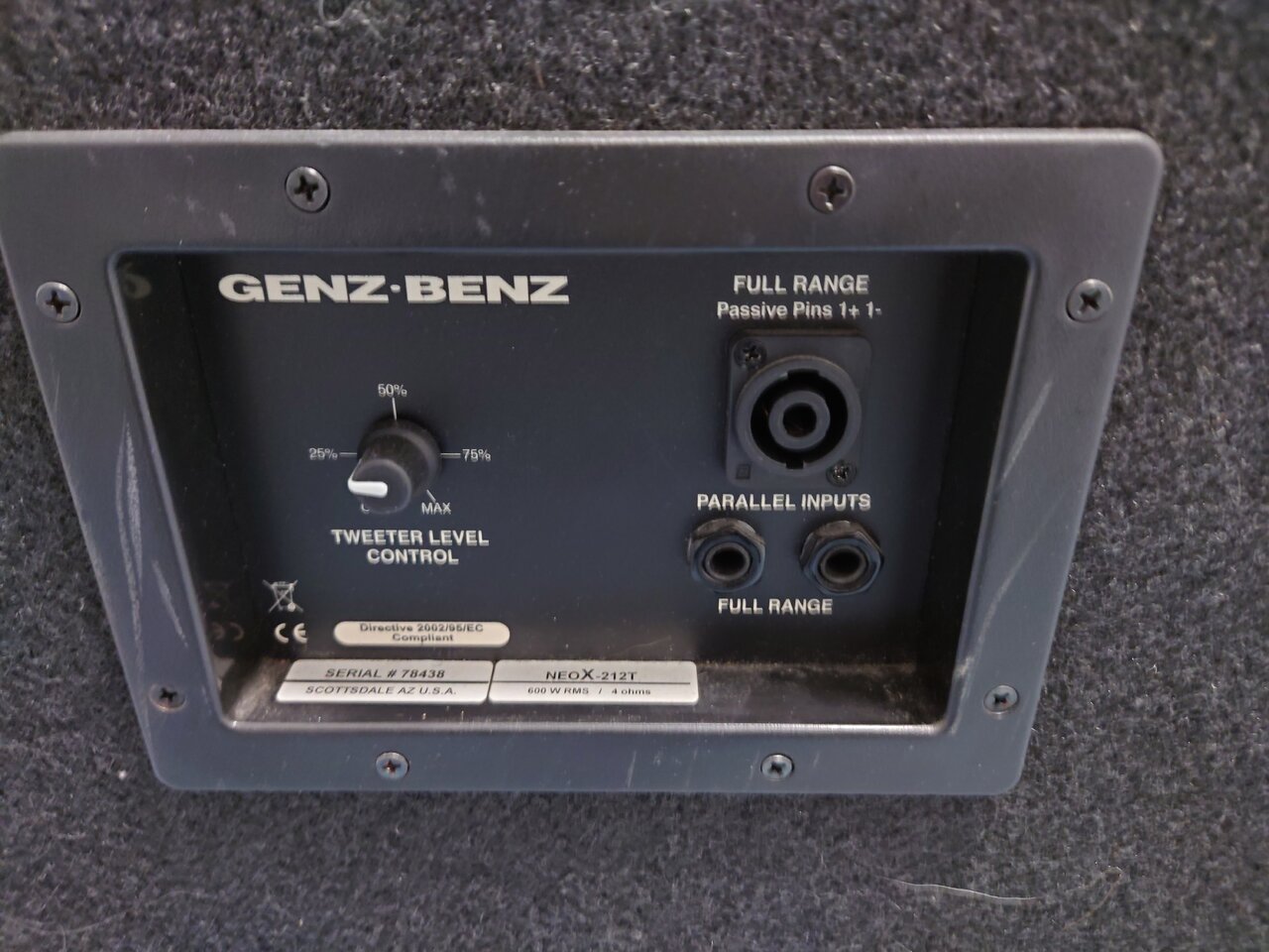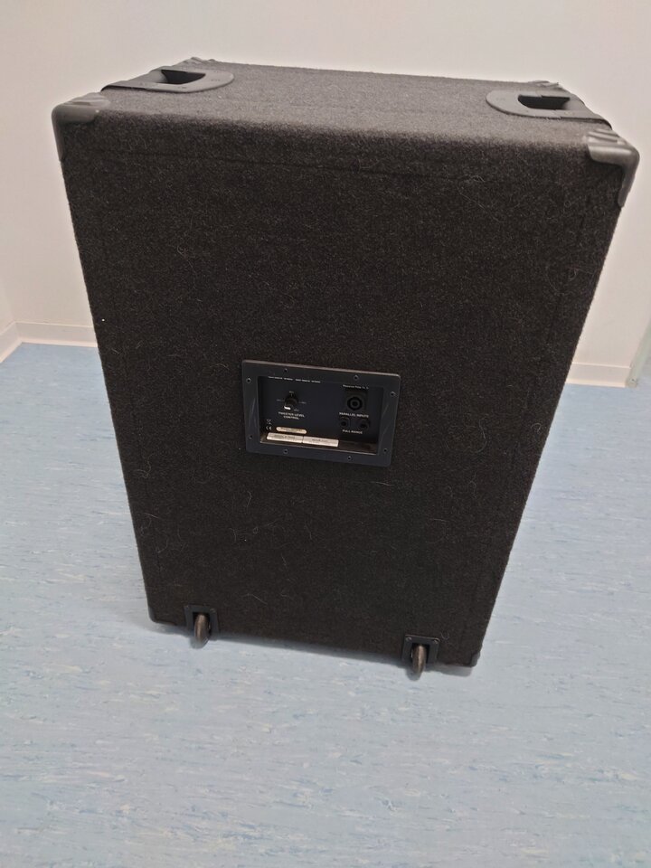 Maße 79 x 54 x 42cm, Gewicht 28kg - die sich aber leichter anfühlen. 2 stabile Griffe und 2 integrierte Rollen. Bassreflex-Gehäuse (Auslässe seitlich vorne), Leistung 600Watt bei 4 Ohm. Mit regelbaren Hochton-Horn. Eingänge Speakon bzw. Klinke.