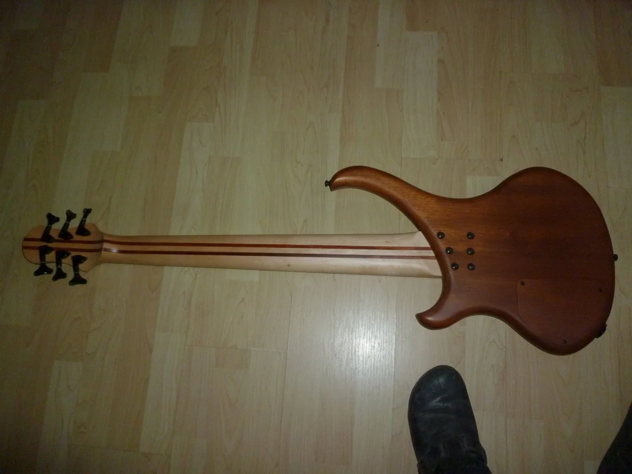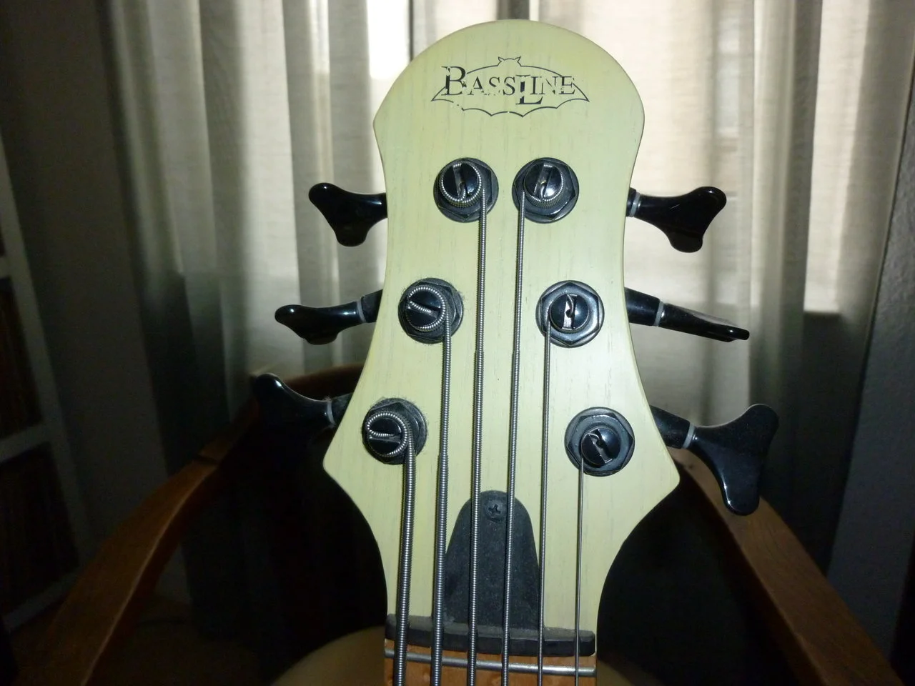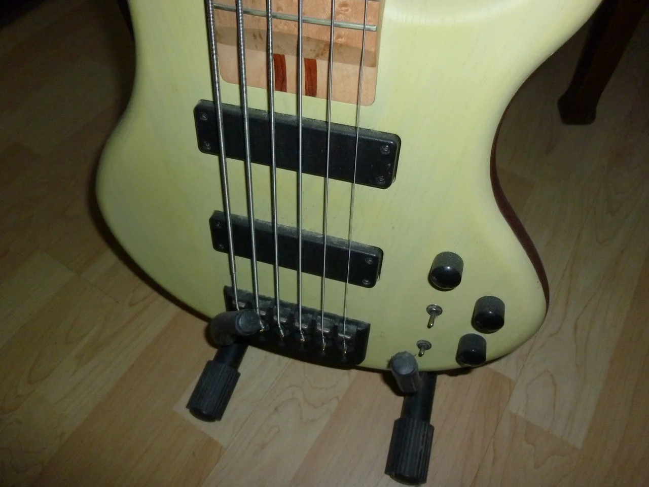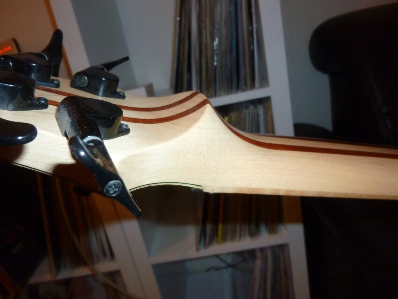 Korpus Mahagoni, Decke Esche, 5 Streifiger Hals, rein Passiv mit Tonblende.