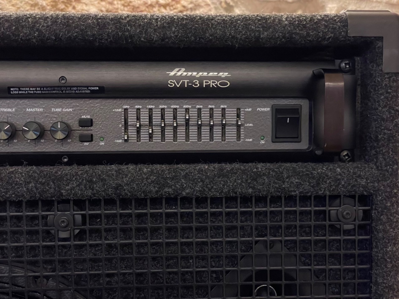 Ampeg SVT-3 PRO Bass-Top, 450 Watt an 4 Ohm / 275 Watt an 8 Ohm, Röhren Pre-Amp mit 3 x 12AX7, Treiberröhren 1 x 12AX7 und 1 x 12AU7, 3-Band-EQ und graphischer 9-Band-EQ, Mid-Tone-Control mit 5 Positionen, Ultra-Low und High Boost, regelbarer DI-Ausgang mit Ground-Lift-Schalter, Effektweg, Preamp Ausgang und Power Amp Eingang, Maße BHT: 48,26 cm (19") x 8,89 cm (2 HE) x 39,37 cm. (Neupreis 2011: 999,00 Euro)