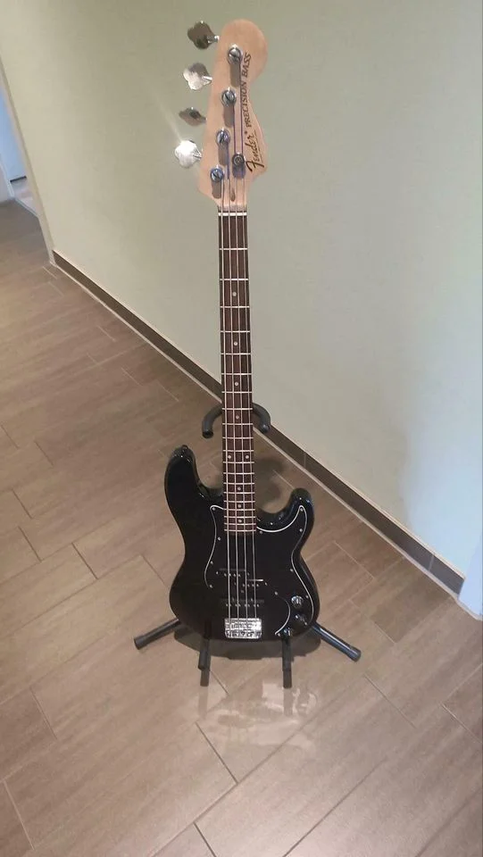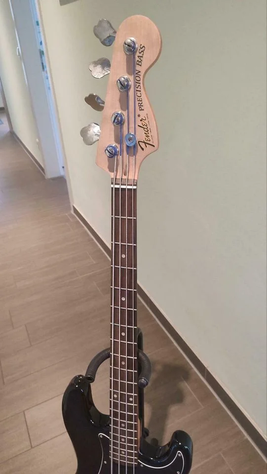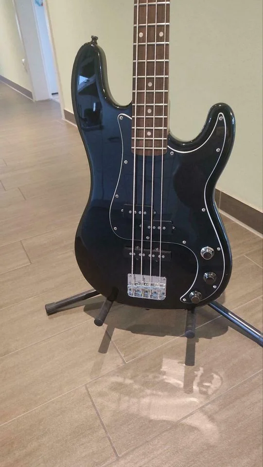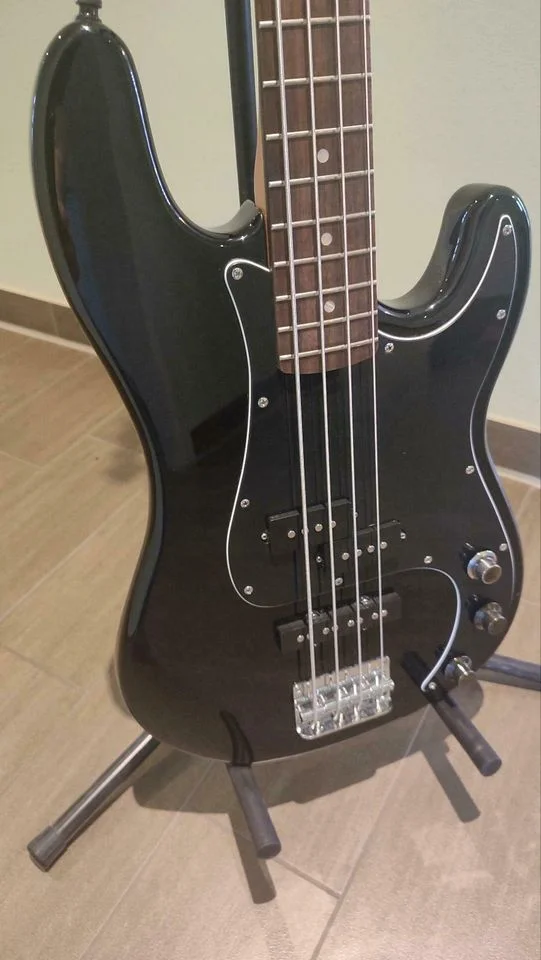 Ich verkaufe ein E-Bass, der aus mehreren Einzelteilen zusammengebaut wurde. Der Korpus aus Erle stammt von einem SX P/J 62-Bass. Der Hals kommt von einem Squier und ist aus Ahorn mit Palisander Griffbrett. Er wurde mit einem Fender Decal versehen. Es ist aber kein Fender Bass!! Der Bass klingt trotz der günstigen Teile erstaunlich gut. Solides Bassfundament mit reichlich Obertönen ist vorhanden. Der Bass wurde als Proberaumhure gut genutzt und hat Spielspuren, der Korpus besitzt einige kleinere Eindrücke im Holz und die Mechaniken sind hakelig, halten aber die Stimmung ohne Probleme.