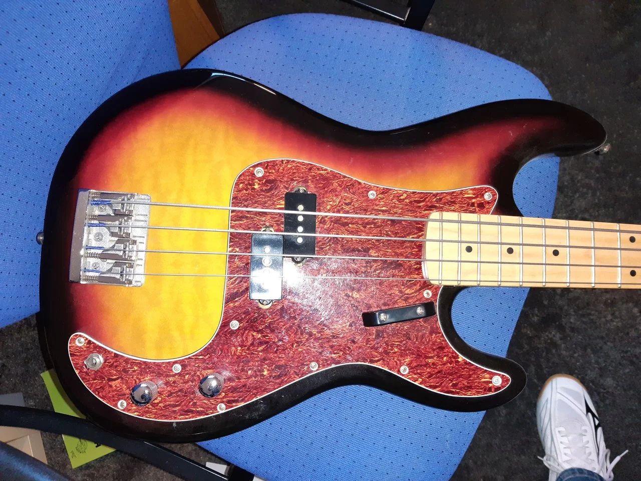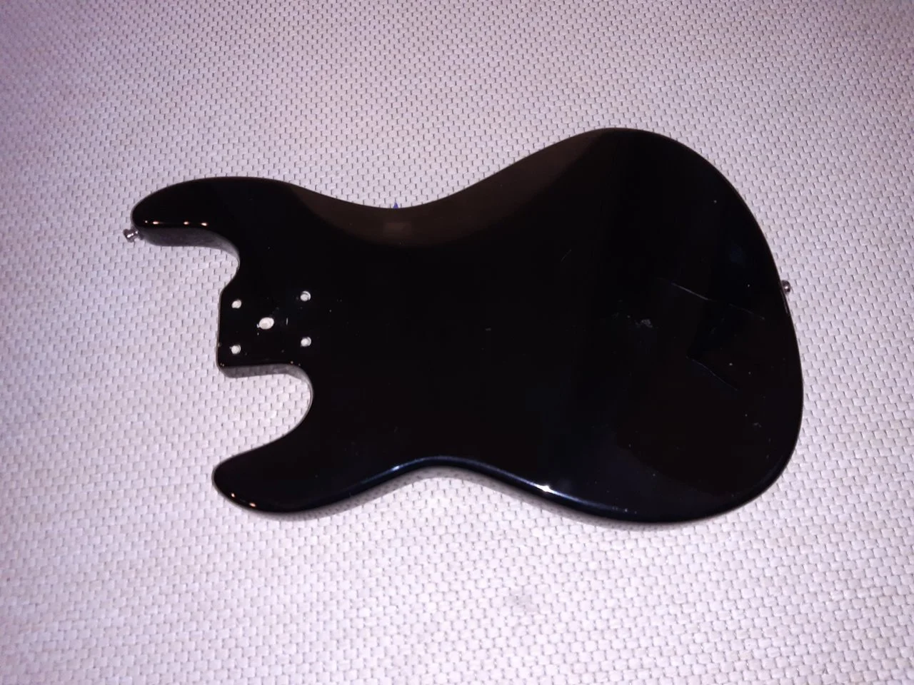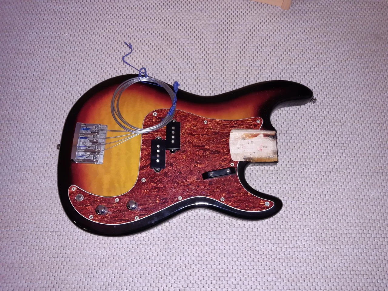 Das Rundum-sorglos-Paket bestehend aus Korpus (unbekannter Herkunft), Rockinger PU, RotoSound Steve Harris Saiten (geschliffen), Schaller Brücke und -Pins.