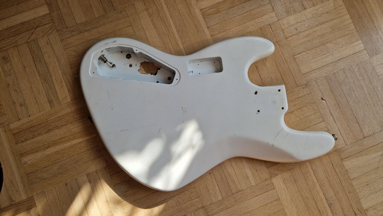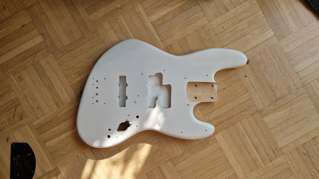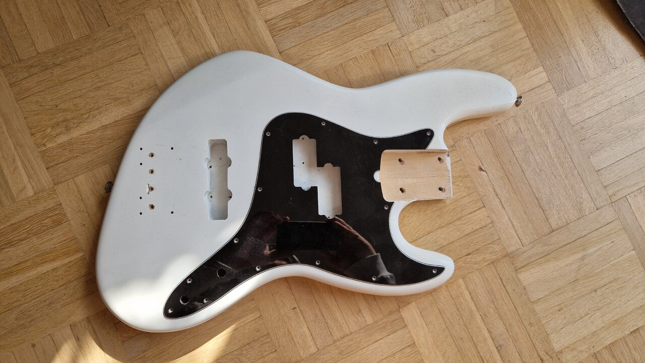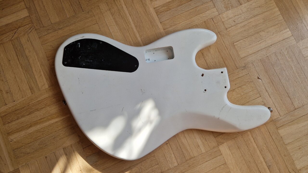 Ein ehemaliger Squier Deluxe Jazz Bass Body, von schwarz auf weiß umlackiert und mit Fräsungen für ein Mark Hoppus Pickguard. Ihr werdet wahrscheinlich nie einen leichteren Body in der Hand gehabt haben, allein schon weil kaum mehr Holz an dem Korpus ist! Das dazugehörige WD Hoppus Pickguard gibt es auch einzeln zu verkaufen!