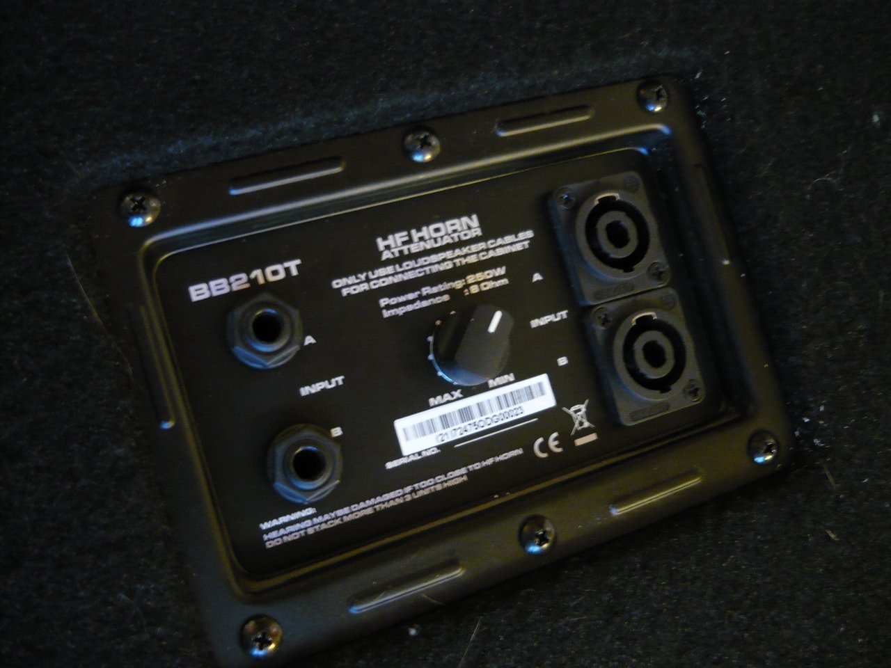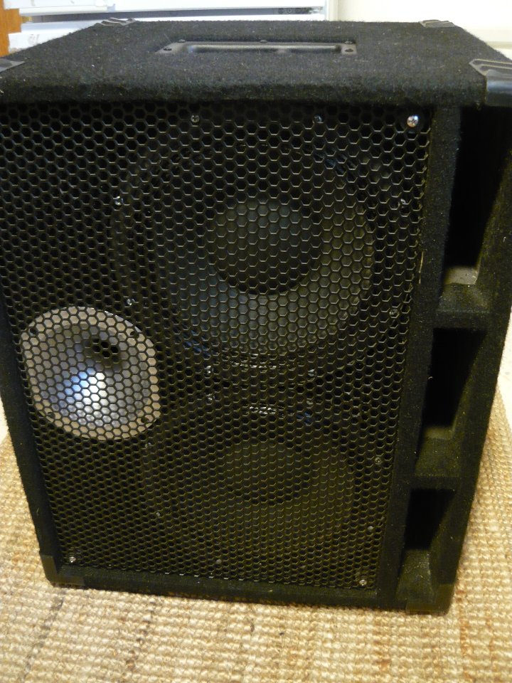 Das Cab war wohl mal eine Harley Benton Box, aber da sind jetzt 2 Bugera Classic Tone 300w Speaker drin, 4 Ohm!