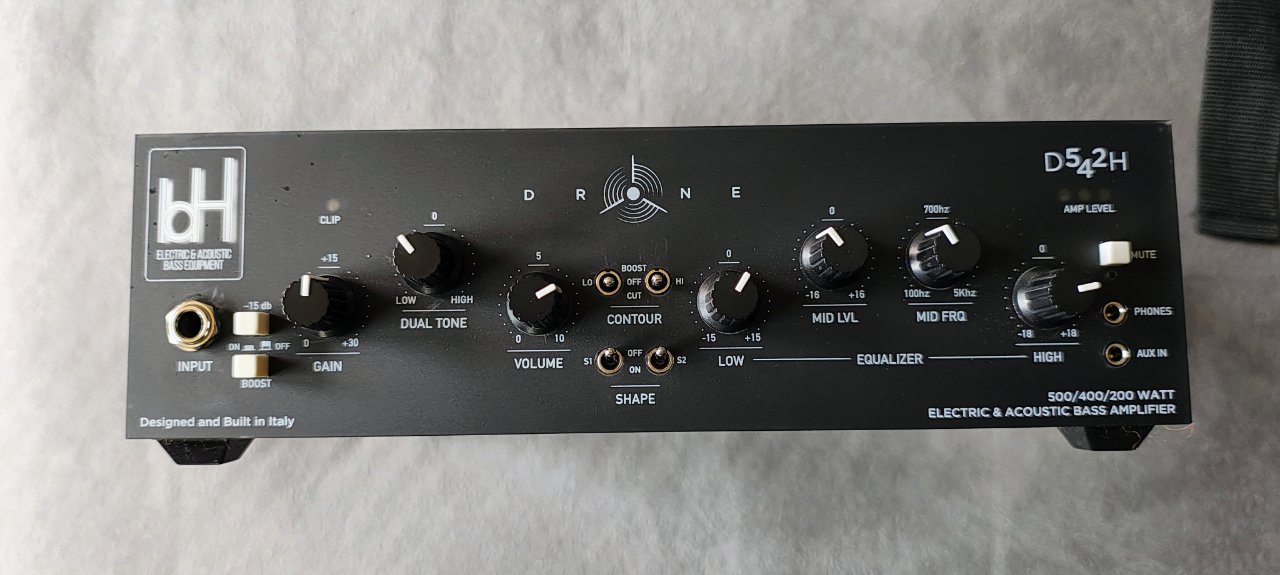 Ich verkaufe einen meiner bh DRONE D542H Bass Amp. Der Drone ist ein unfassbar flexibler, ausgecheckter, leise operierender, und leistungsstarker, sehr gut klingender Bassverstärker. Er ist für elektrische und akustische Bässe geeignet. Die parametrische Klangregelung und der Blend Mode geben einem unendliche Möglichkeiten, den natürlichen Klang der des Instrumentes zu formen und optimieren. Der Amp klingt schön 3-dimensional und musikalisch. Die Grundausrichtung ist neutral OHNE steril zu sein. Musikalisch und tight. Sehr gut!