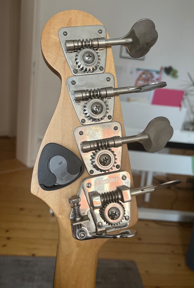 Verbaut ist ein Hipshot D-Tuner (Original Tuner vorhanden), ein aktiver EMG Split Coil Pickup, eine stilechte Schaller 3D Bridge und „natürlich“ Schaller Security Strap Buttons.