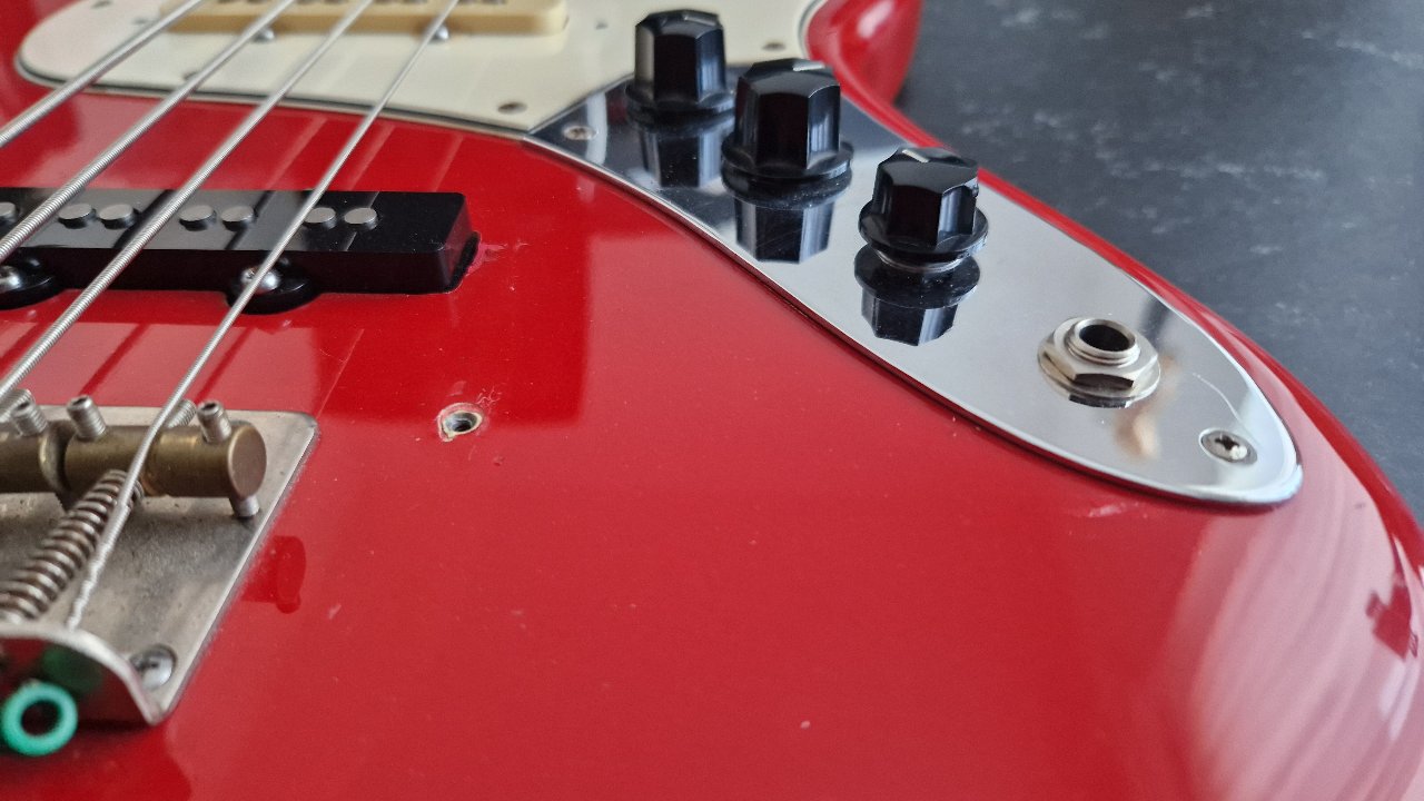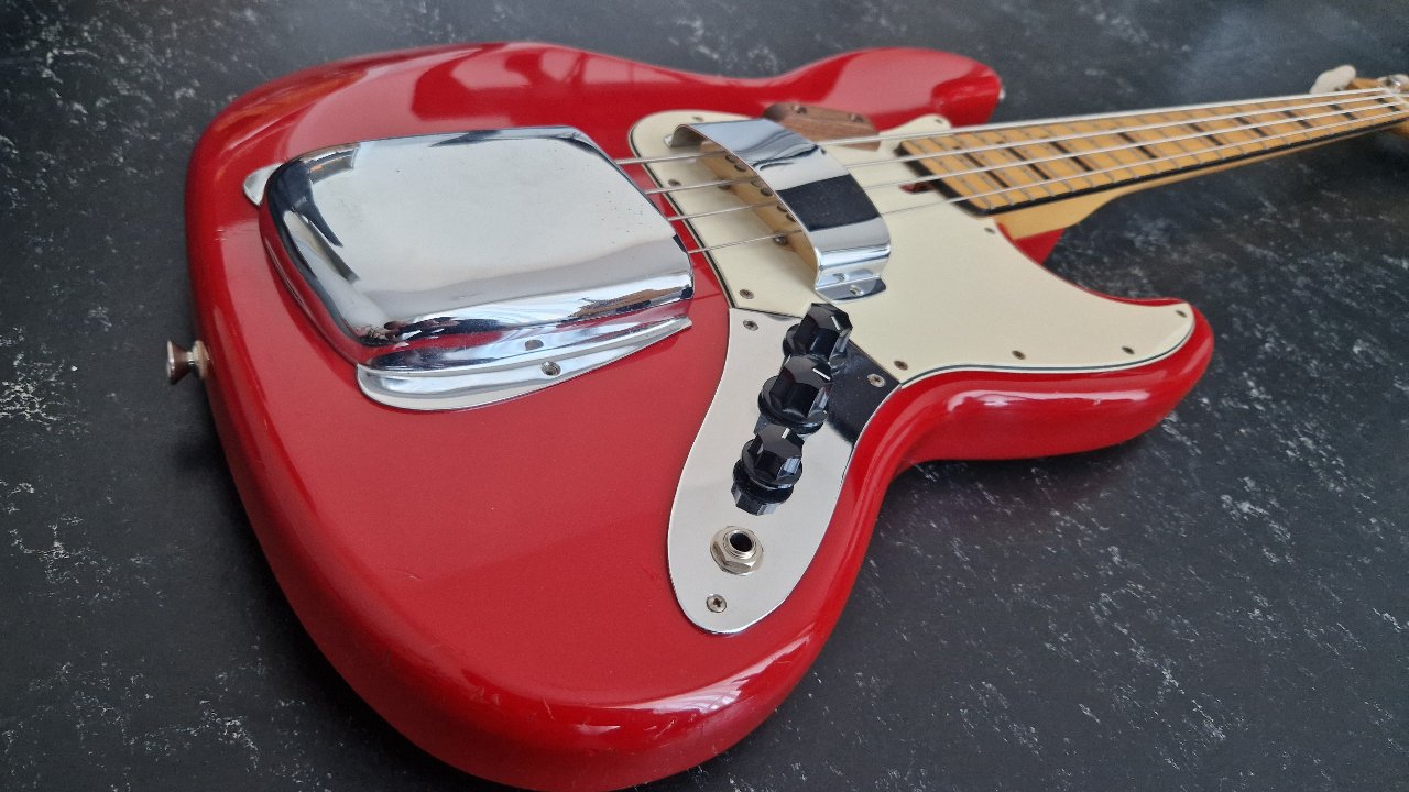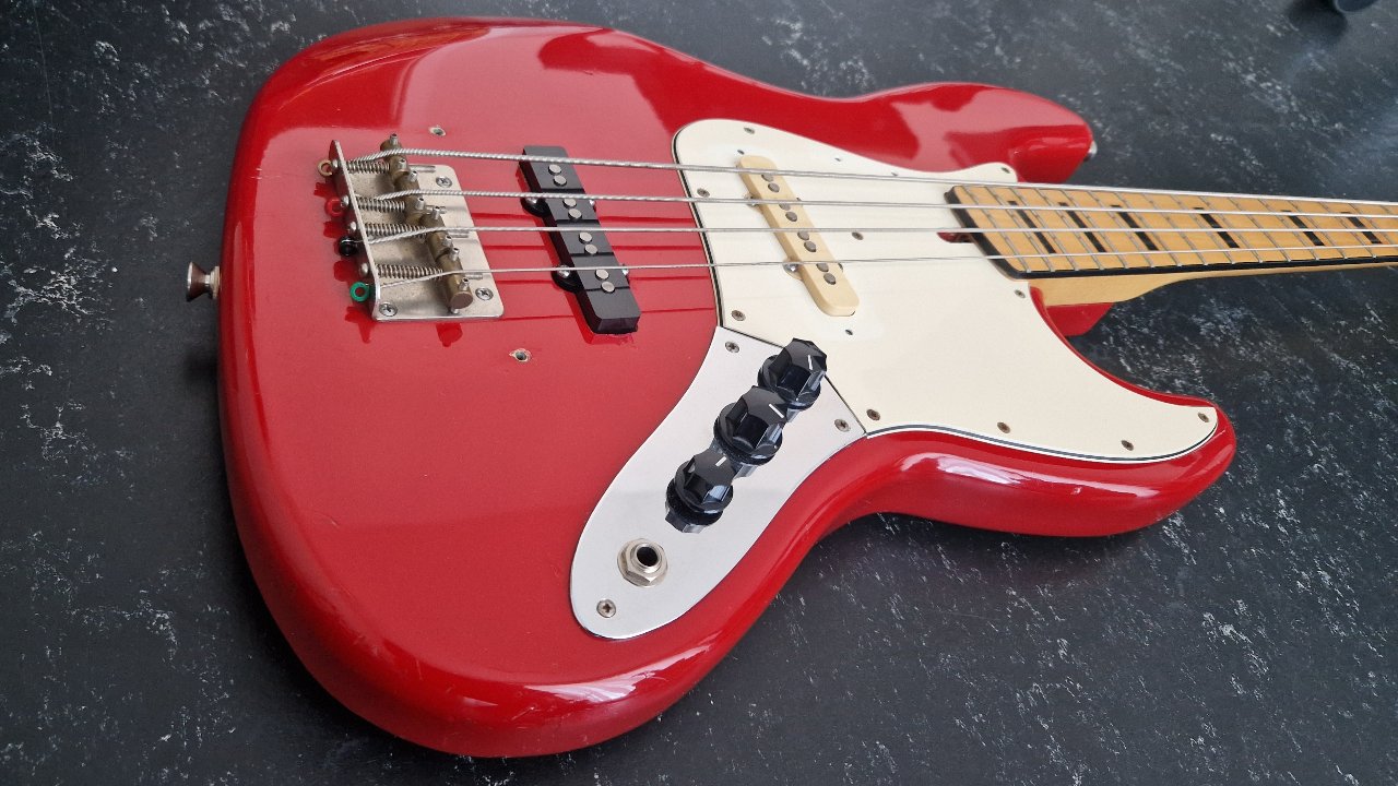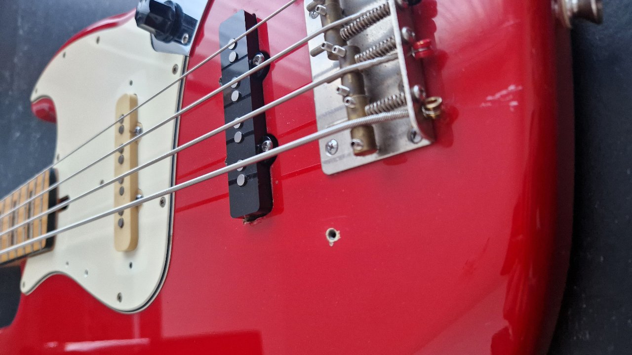 Der Steg-Tonabnehmer wurde leider durch den Vorbesitzer ersetzt, wozu auch die Fräsung etwas vergrössert und einige Stellen um die Fräsung mit roter Farbe etwas "retouchiert" werden mussten. Zudem verfügt der Bass über einige Abnutzungsspuren, insbesondere auf der Korpusrückseite sowie an den Seiten, was bei einem über 40 Jahre alten Instrument jedoch zu erwarten ist. Die Mängel sind jedoch alle rein optischer Natur und beeinflussen die Bespielbarkeit in keinster Weise.