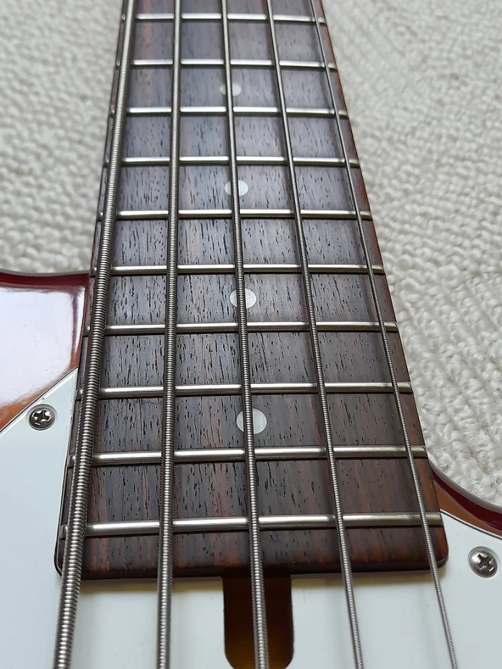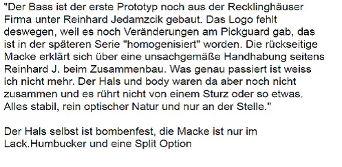 Der Zustand ist gut bis sehr gut; einzig kaum sichtbare kleine, beim Bespielen unvermeidbare Krätzerchen, kleinste Absplitterung an der oberen Griffbrettkante (man kann es also beim Spiele nicht spüren) und der Lackschaden an den Halsschrauben (s.Bilder) => s. Text vom Vorbesitzer. Dafür habe ich eine schwarz lackierte Edelstahlplatte montiert, die den Lackschaden abdeckt. Kann dann vom Käufer entschieden werden, ob er den Bass mit oder ohne Halsbef.-Platte haben will. Der Body-Lack ließe sich bestimmt auch ausbessern.