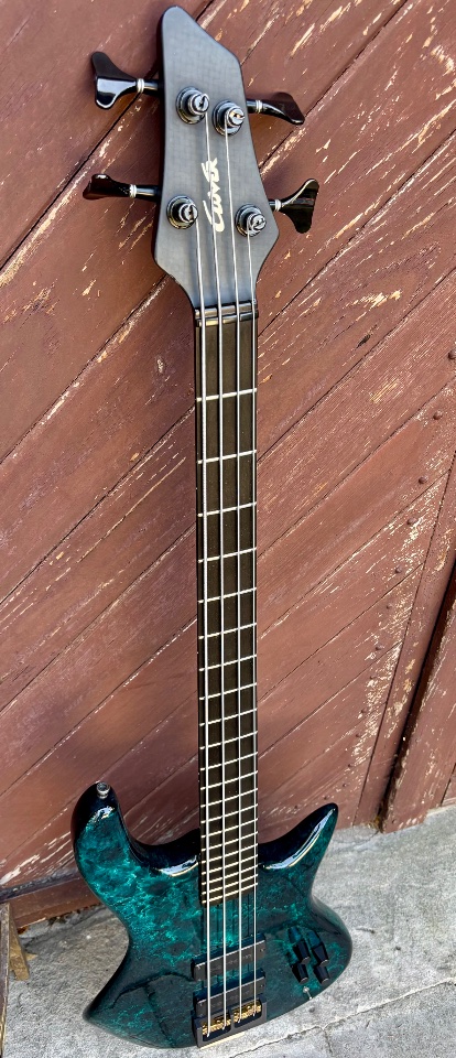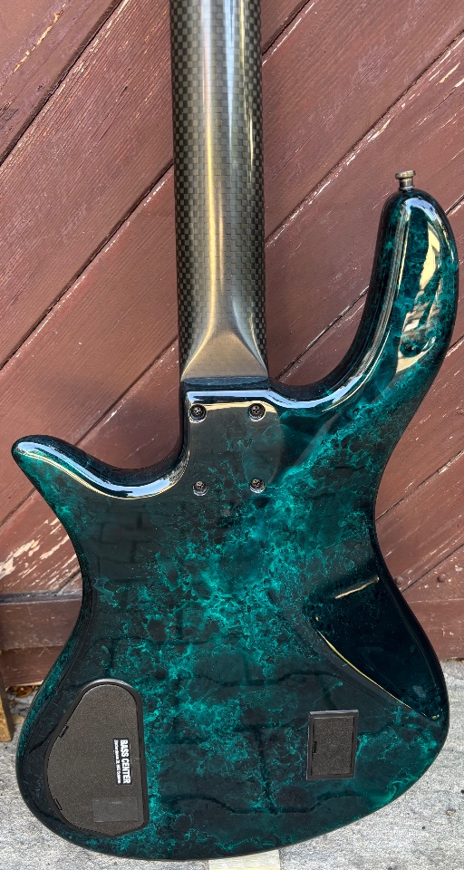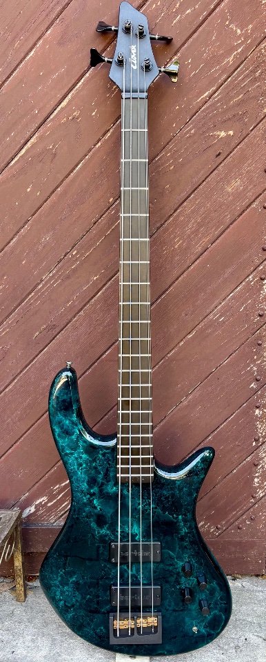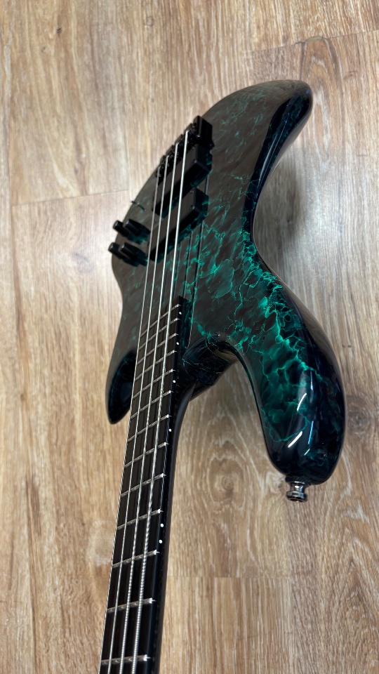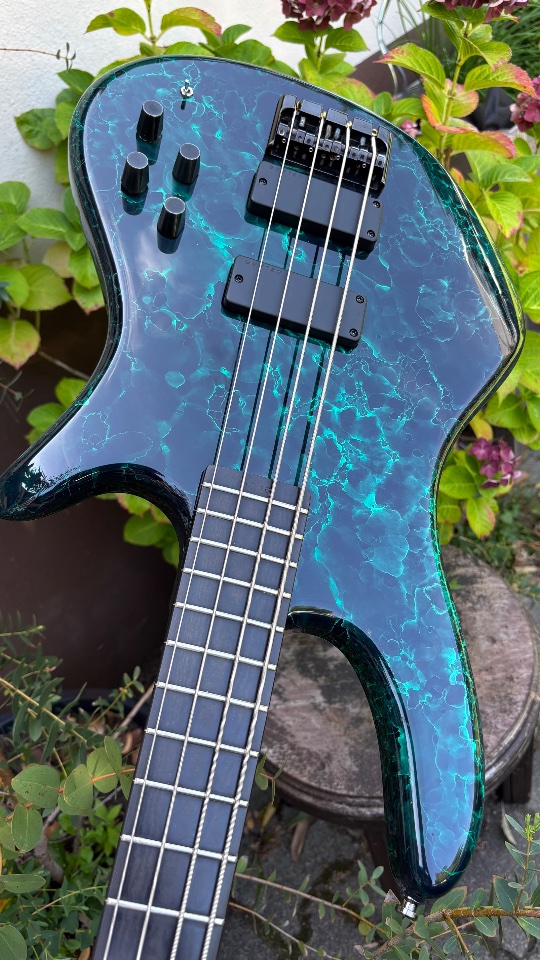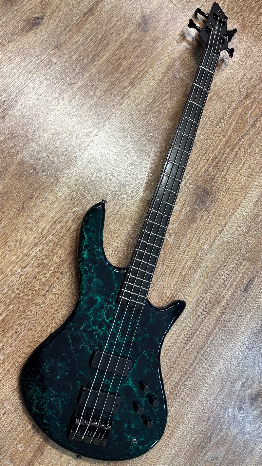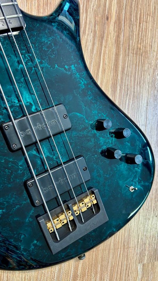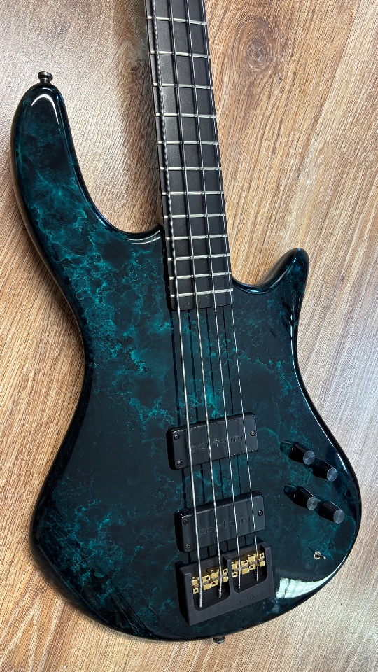Der Bass überzeugt nicht nur durch seine außergewöhnliche Optik mit dunkel marmorierter Lackierung und goldfarbenen Hardware-Elementen – ein echter Hingucker auf jeder Bühne. Die Bespielbarkeit ist dank flacher Saitenlage butterweich, und besonders bei Slap-Techniken entfaltet er seinen knackigen, funkigen Charakter.