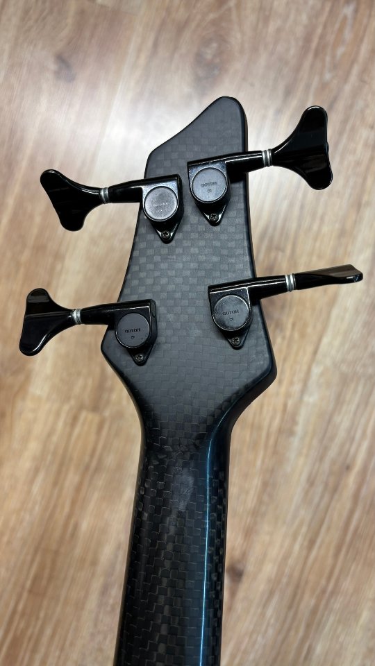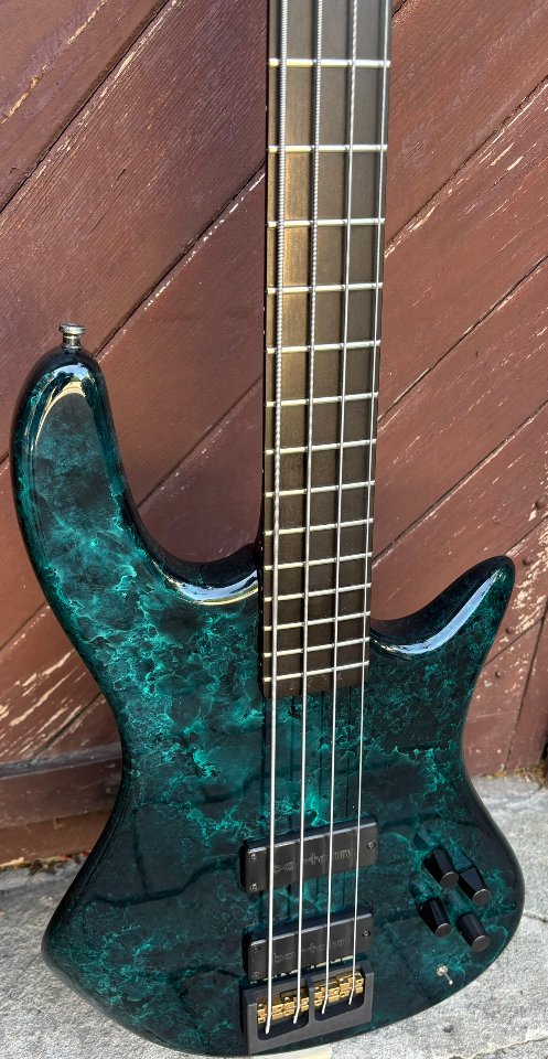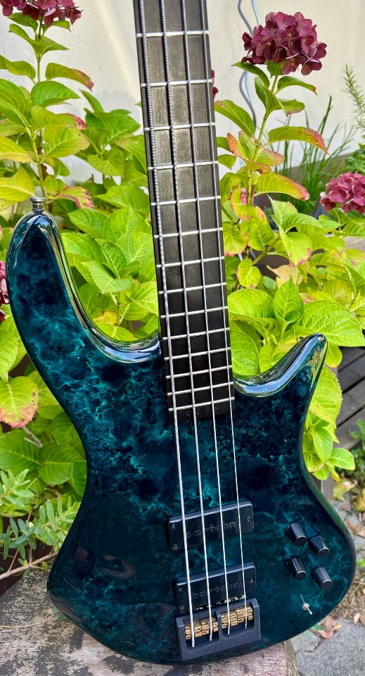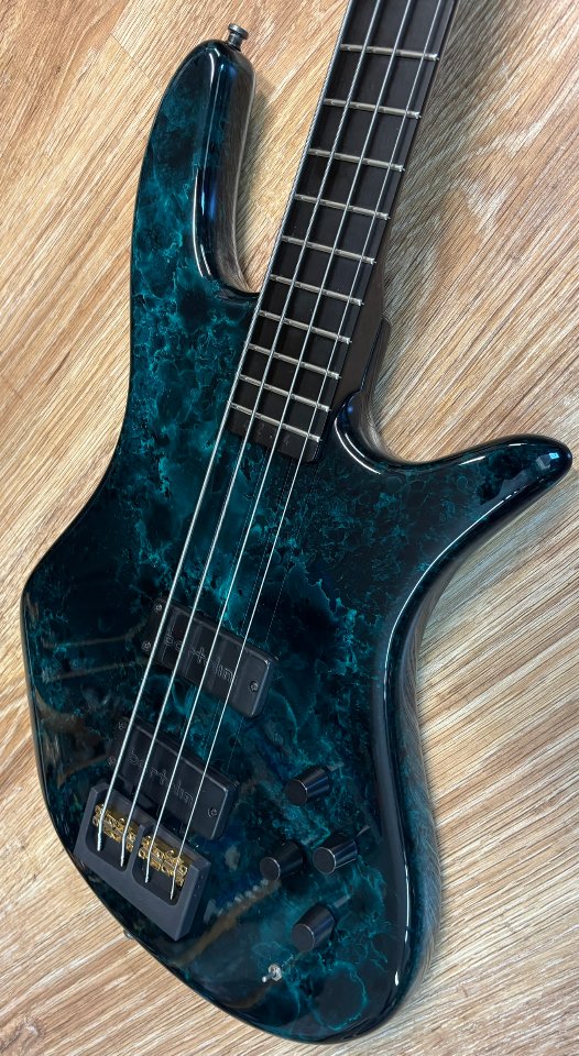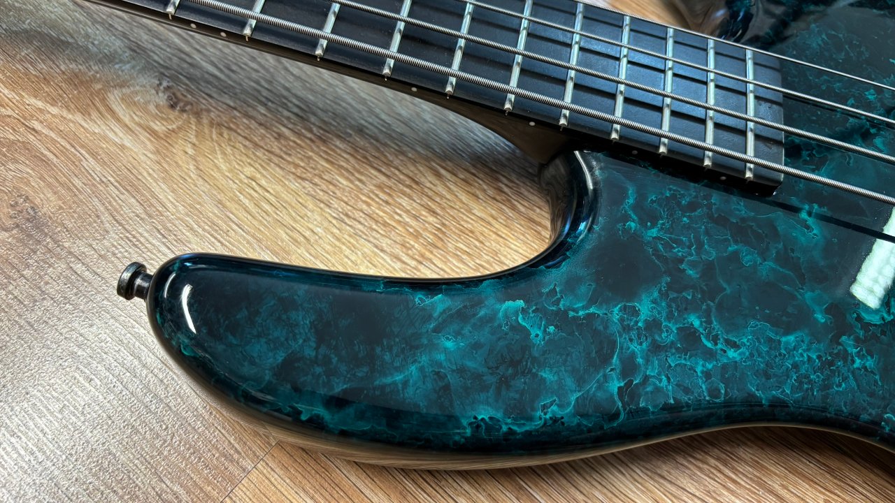 Der Bass überzeugt nicht nur durch seine außergewöhnliche Optik mit dunkel marmorierter Lackierung und goldfarbenen Hardware-Elementen – ein echter Hingucker auf jeder Bühne. Die Bespielbarkeit ist dank flacher Saitenlage butterweich, und besonders bei Slap-Techniken entfaltet er seinen knackigen, funkigen Charakter.