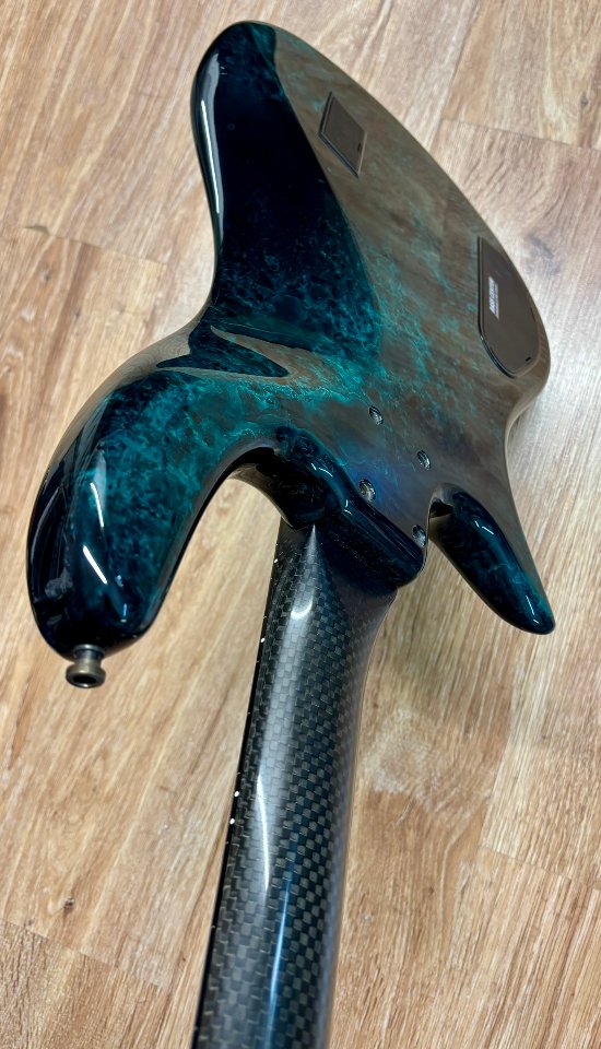 Zum Verkauf steht ein seltener Clover Avenger Carbon (Baujahr ca. 1995) mit 21 Bünden, edlem Green Marble Finish, Bartolini Pickups und Bartolini 2-Band Klangregelung – umschaltbar auf aktiv oder passiv über Miniswitch.