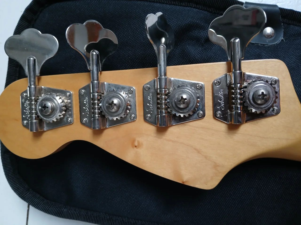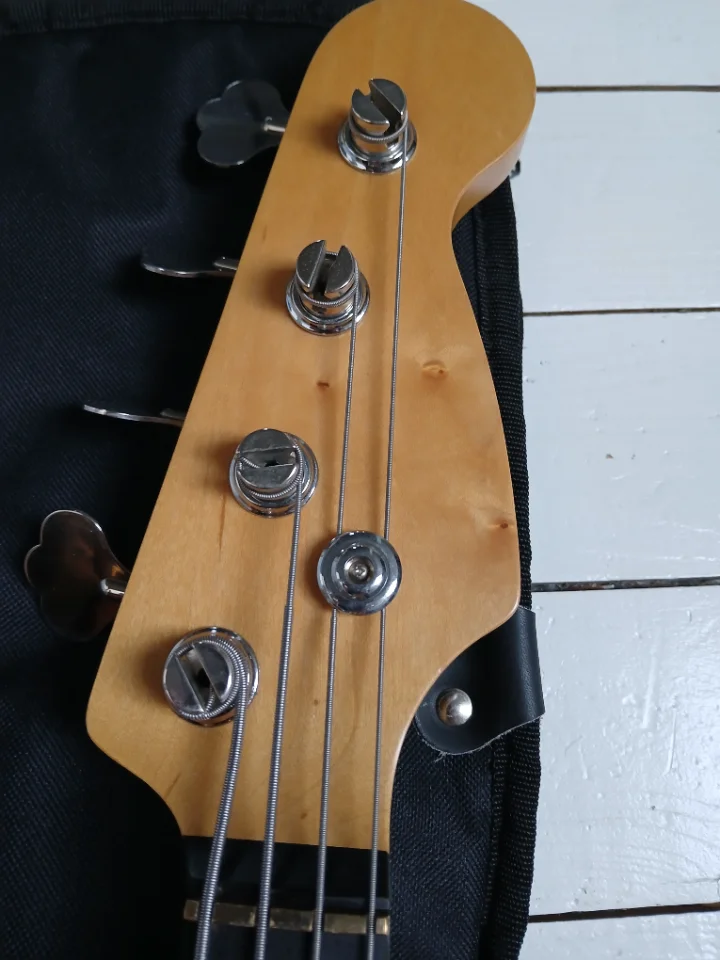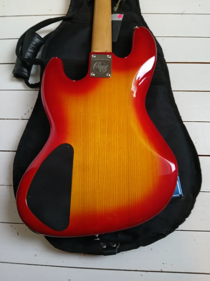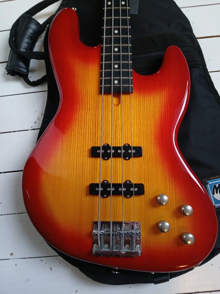 Rätselhafter, hochwertiger JB mit wunderschöner Cherryburst Lackierung, Eschekorpus, Maple neck mit birdseye spots und tollem Ebenholz-FB. Er wurde lt. Vorbesitzer zu einem Firmenjubiläum der Firma Musik-Wein in Hannover gebaut (s. Tasche und Neckplate). Hals und Body sind nach m. M. von Rockinger, aber es gibt keine Stempel, nur eine Bleistiftsignatur in der Halstasche. Ich habe die Tuner durch Schaller ersetzt und die merkwürdig aussehenden PUs durch welche aus einem alten Ibanez Silver Series. Die PUs liegen dicht zusammen und es ergibt sich ein sehr knurriger, bridgelastiger Sound. Kein Leichtgewicht!!