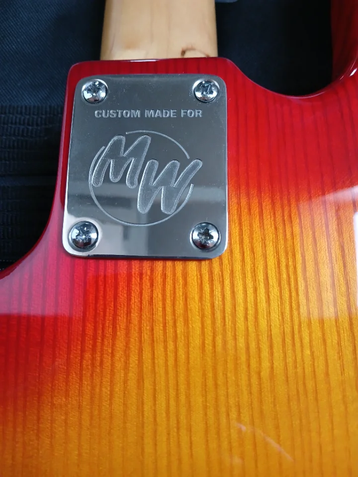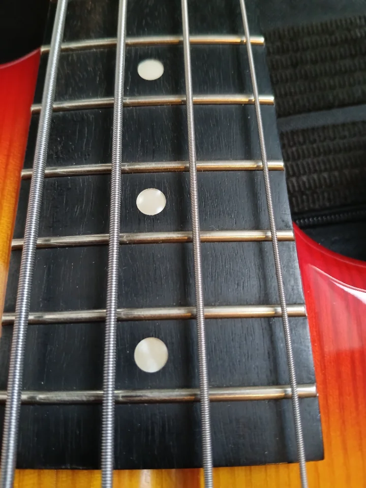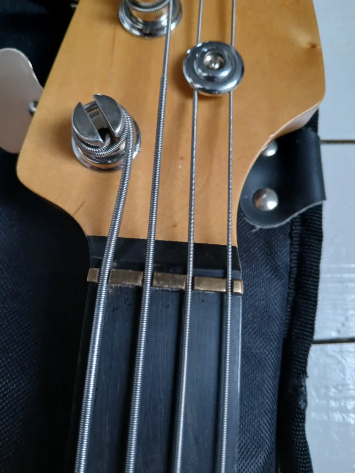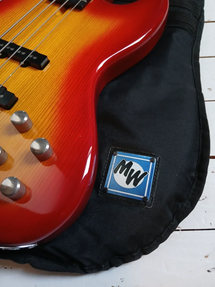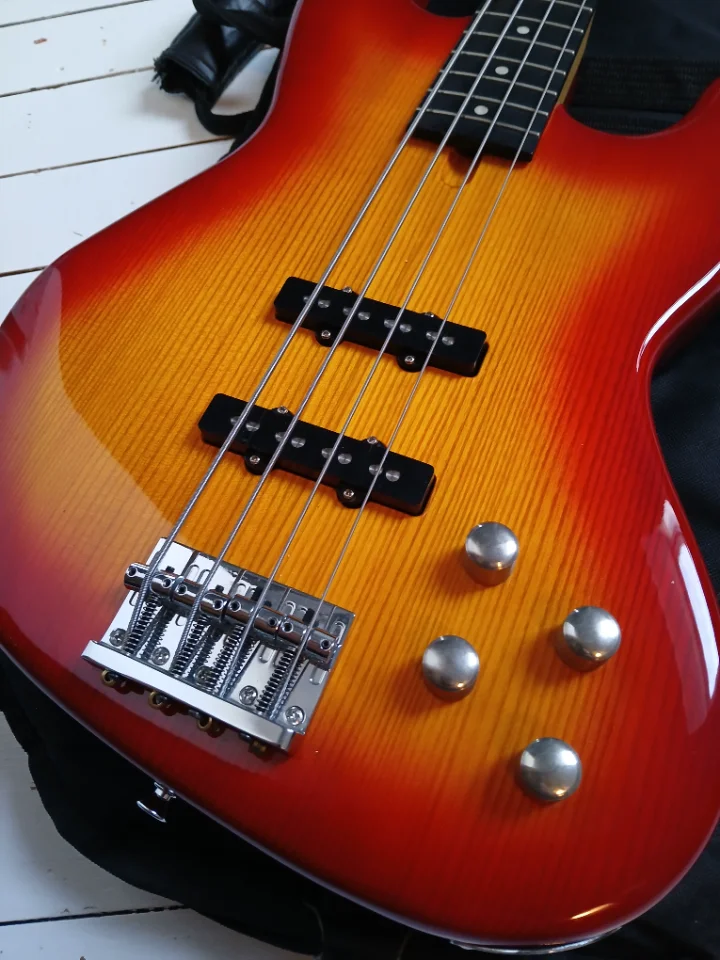 Rätselhafter, hochwertiger JB mit wunderschöner Cherryburst Lackierung, Eschekorpus, Maple neck mit birdseye spots und tollem Ebenholz-FB. Er wurde lt. Vorbesitzer zu einem Firmenjubiläum der Firma Musik-Wein in Hannover gebaut (s. Tasche und Neckplate). Hals und Body sind nach m. M. von Rockinger, aber es gibt keine Stempel, nur eine Bleistiftsignatur in der Halstasche. Ich habe die Tuner durch Schaller ersetzt und die merkwürdig aussehenden PUs durch welche aus einem alten Ibanez Silver Series. Die PUs liegen dicht zusammen und es ergibt sich ein sehr knurriger, bridgelastiger Sound. Kein Leichtgewicht!!