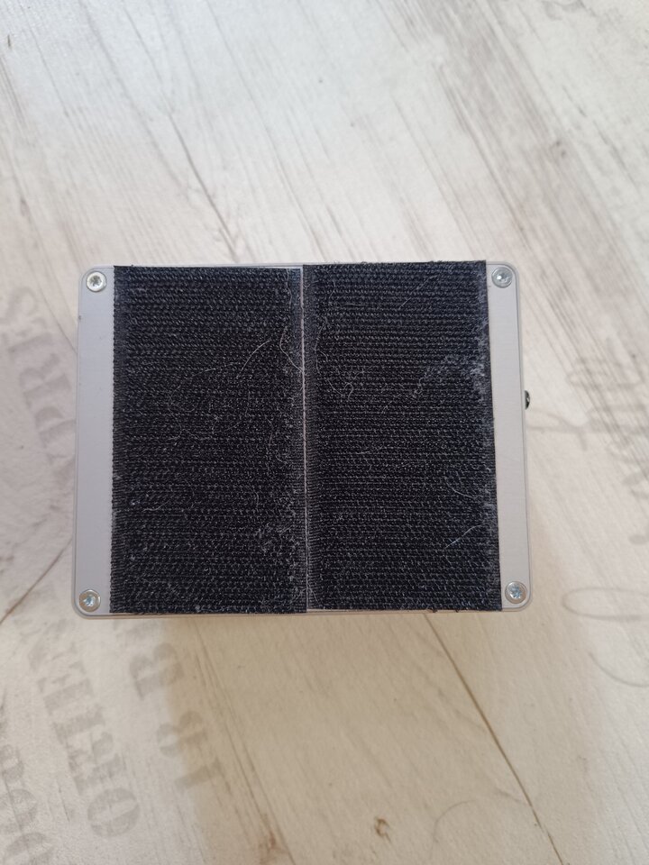 Auf der Unterseite ist noch Klettband befestigt, Gummifüße sind nicht mehr vorhanden.