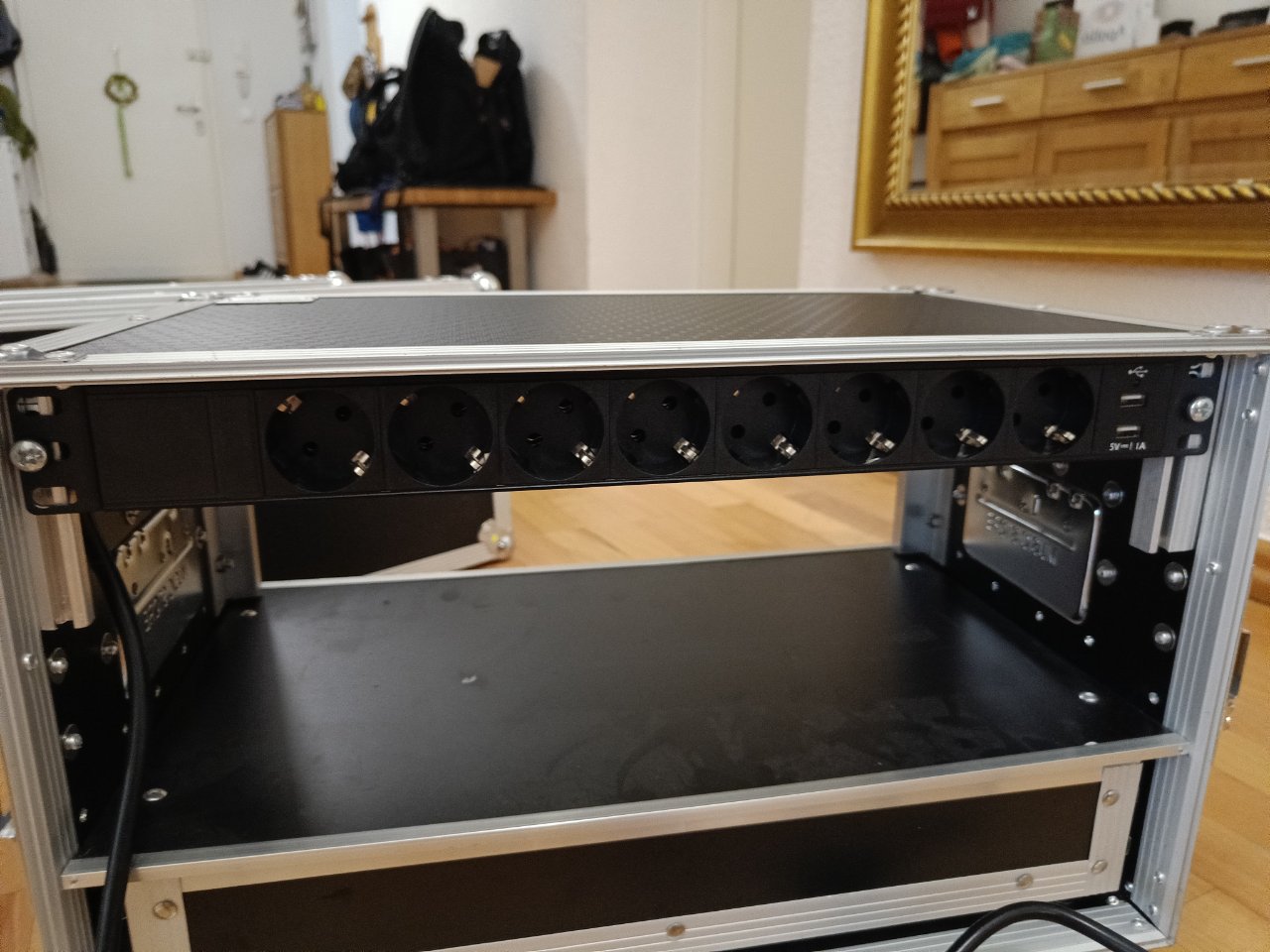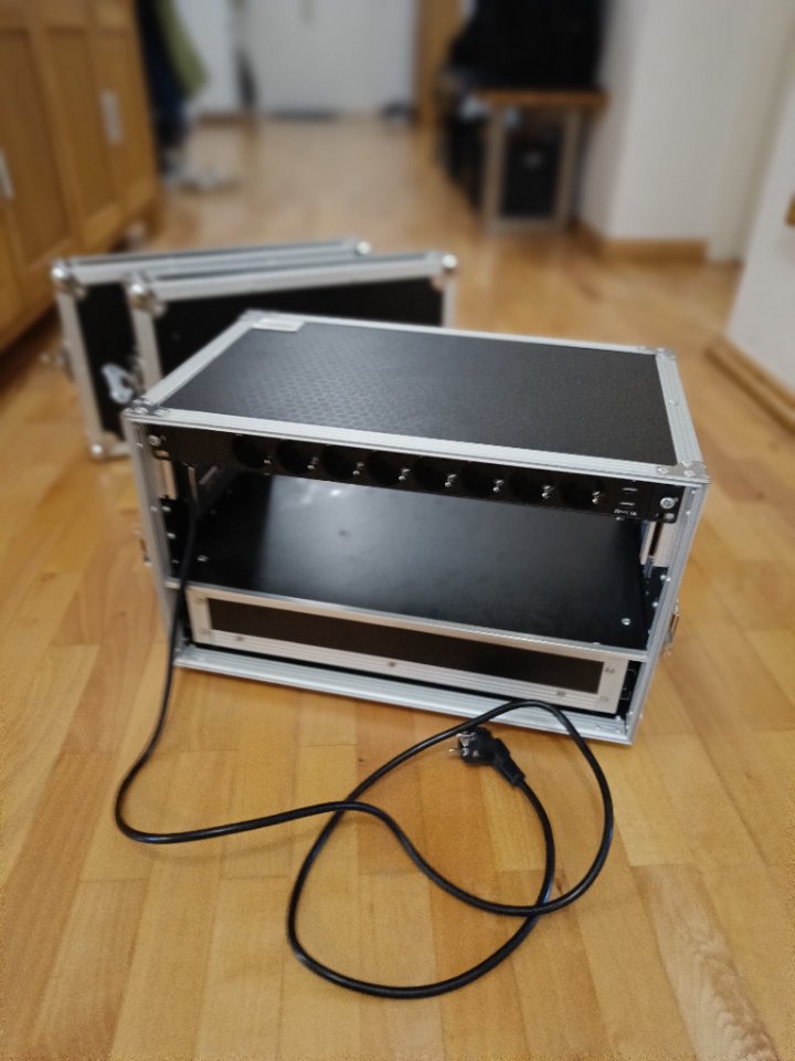 Von Hause aus hat das Rack hinten keine Schiene. Ich habe eine zusätzliche eingebaut und ordentlich vernietet. Dort hängt jetzt die Strom-Leiste inkl USB Ladebuchsen (https://www.thomann.de/de/the_t_racks_power_8_s_usb.htm , Neupreis 35 Euro). Eine weitere 1HE-Einheit lässt sich montieren
