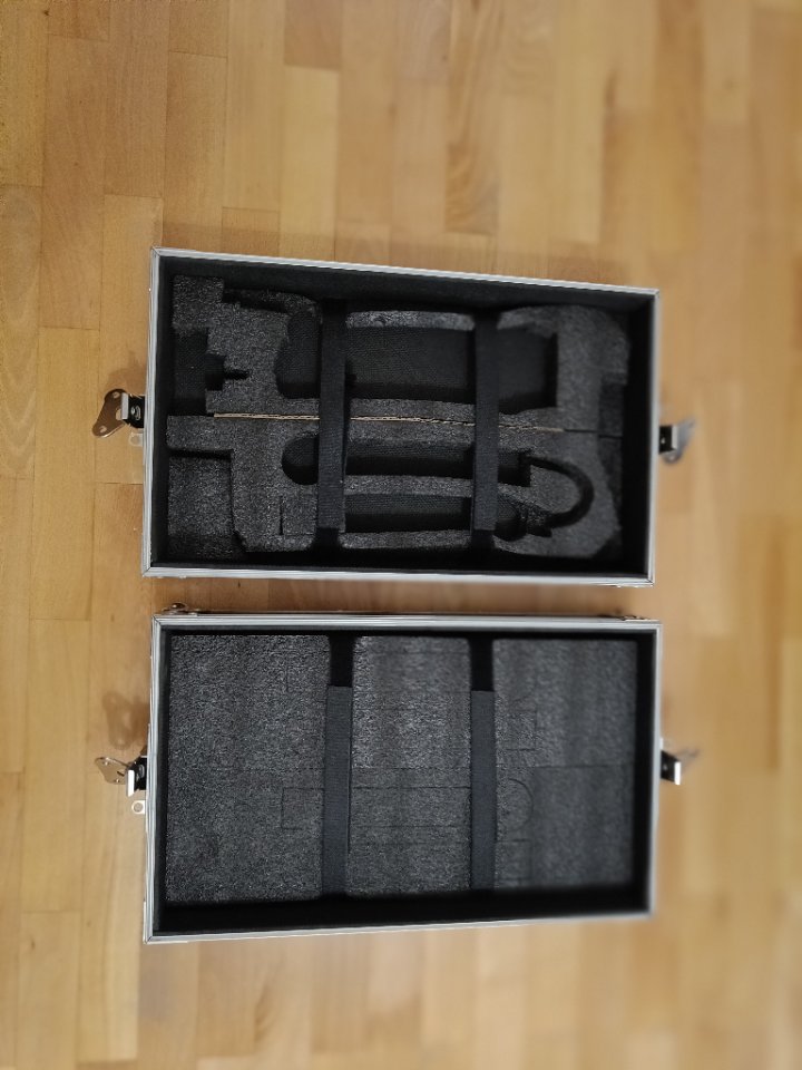Entnehmbar Schaumstoff in beiden Deckeln mit Möglichkeit, Ausschnitte raus zu trennen und damit Aufbewahrungsfläche für Zeugs zu schaffen, das mit muss - bei einem Deckel habe ich das so gemacht (Aussparung hier für die im Angebot nicht enthaltenen 2x speakon, 3er Stromverteiler mit 3m Kabel, 10m xlr, 3er Stromverteiler als Stecker).