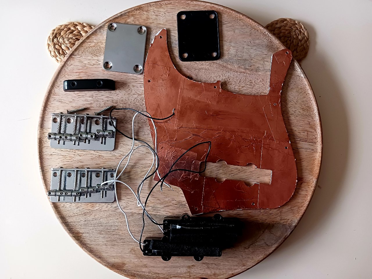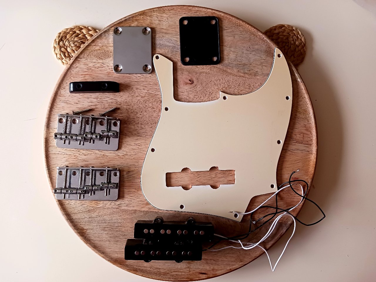 - Halsplatte Chrom mit schwarzer Gummiunterlage (stammt wahrscheinlich von einem HB JB-75 Vintage Bass)
