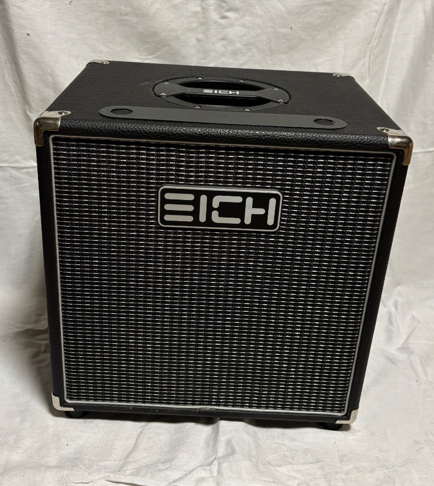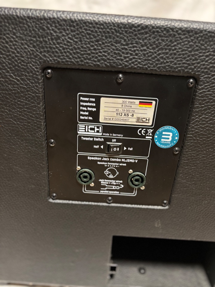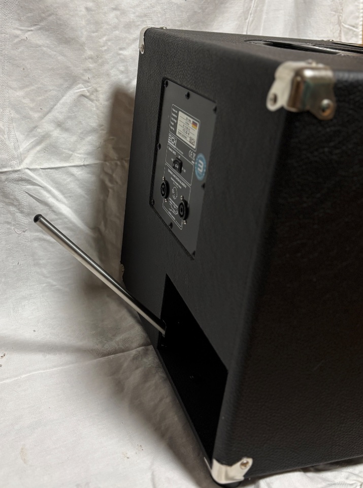 Für nen schmalen Taler gebe ich noch einen tadellosen Bugera Veyron 1001 M dazu. Der hat eine magnetische Halterung spendiert bekommen, sodass er auch im gekippten Zustand der Box bombenfest hält. So macht es Eich ja auch mit den hauseigenen Amps.