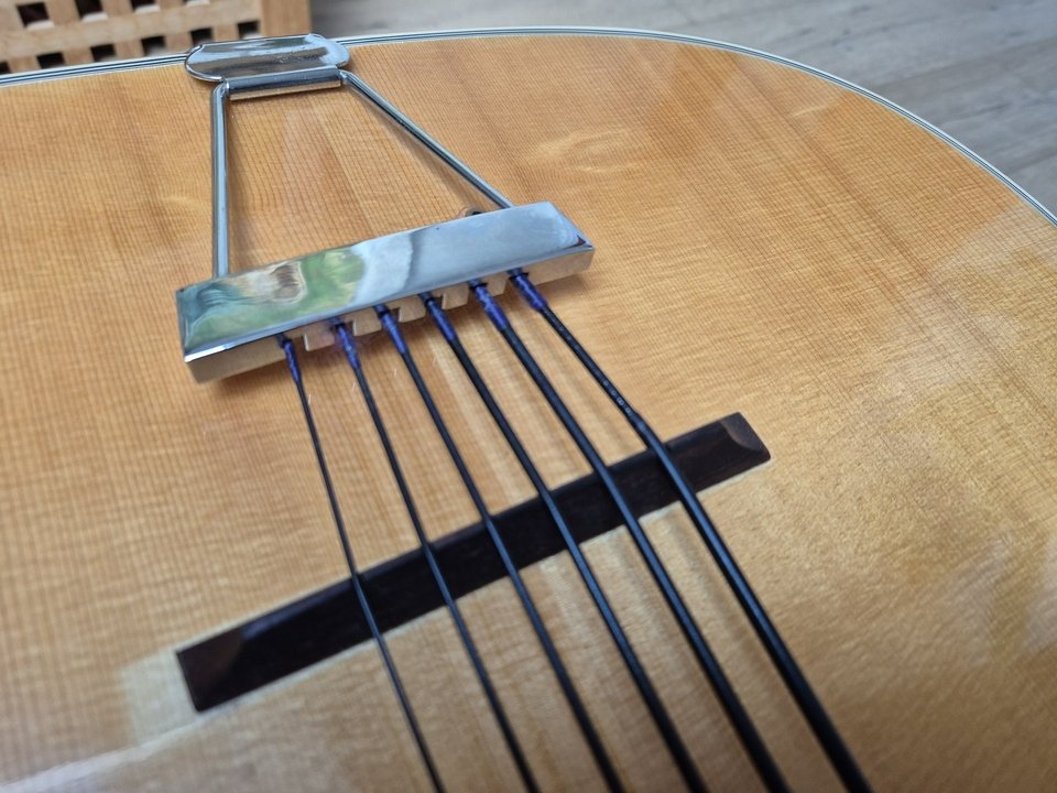 Nachgerüsteter Piezo-Tonabnehmer unter der Brücke, 9V-Batterietasche innen im Korpus.