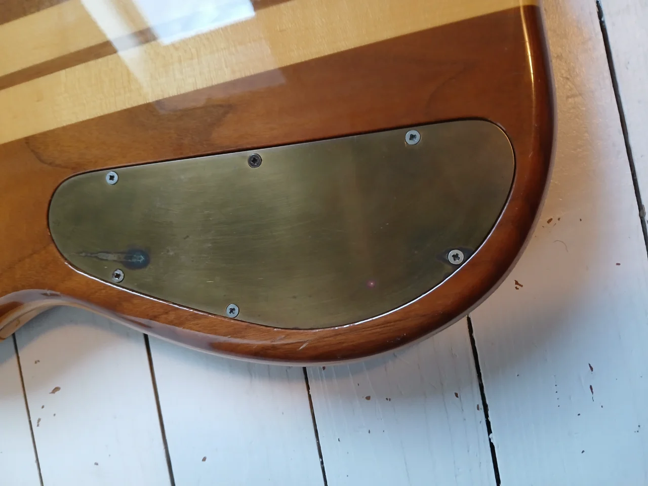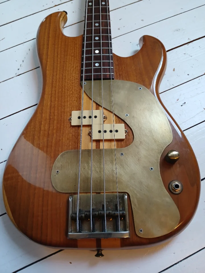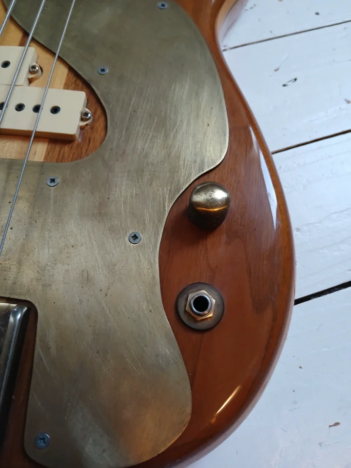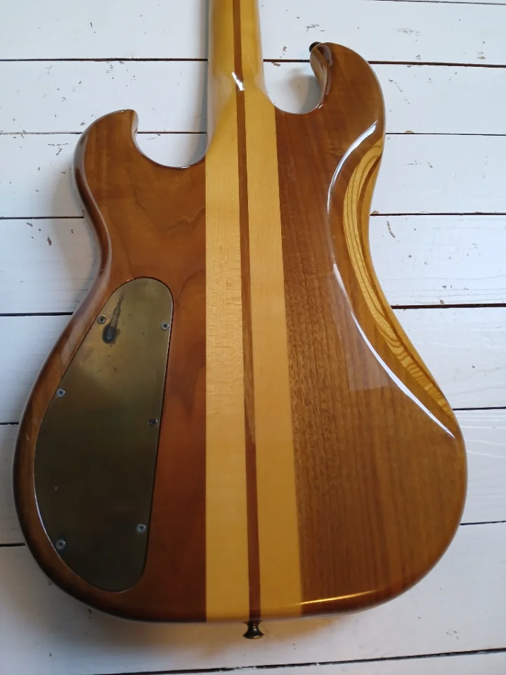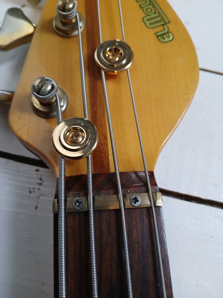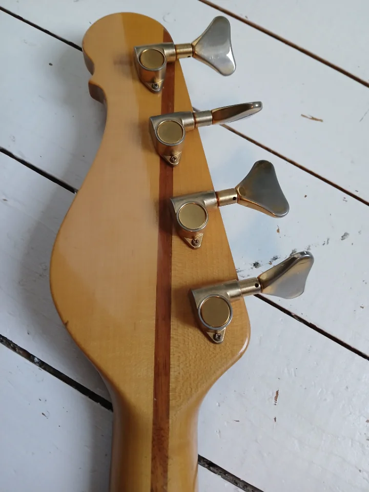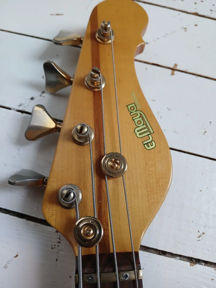Hochwertiges Instrument aus der bekannten japanischen El Maya Serie. Leider hatte wohl jemand a) einen Messing- und b) einen Bastelfimmel...ehemaliger PJ mit Umbau zum P- Bass. Alles massive Messing Hardware. Brachial rockig dank Di Marzio ( oder alte Schaller?) PU in Creme.