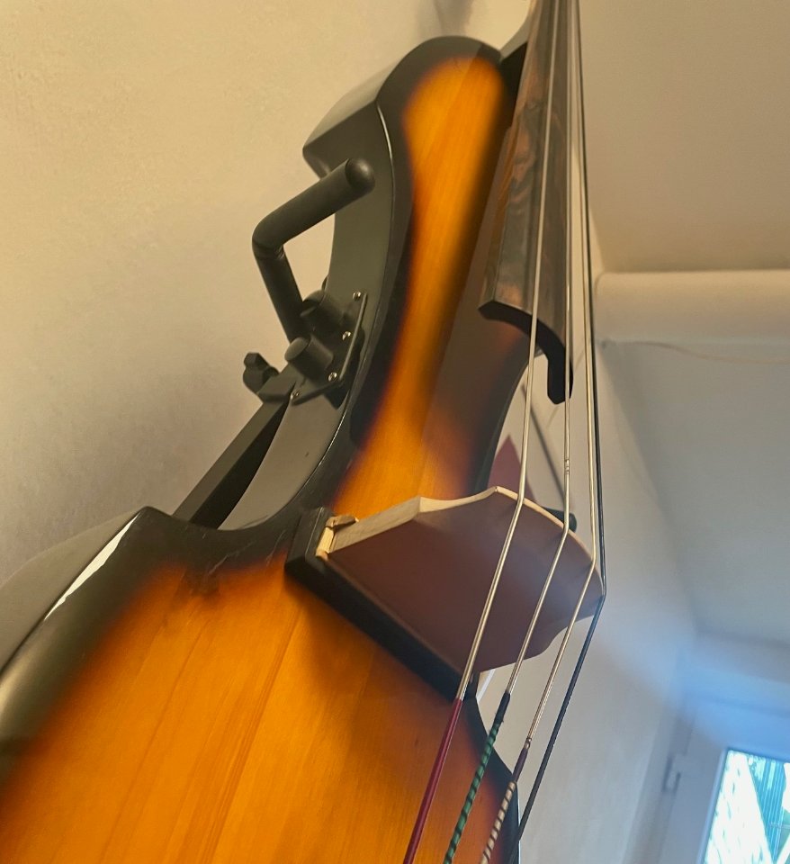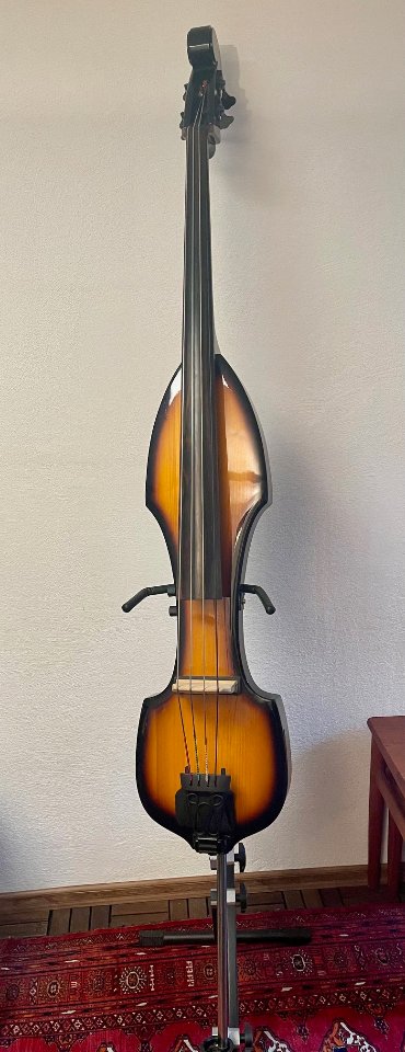 Optisch einer der schöneren E-Kontrabässe, finde ich. Könnte ein alter Aria sein. Der Steg und die Aktiv-Elektronik wurde von Vogel Guitars erneuert.