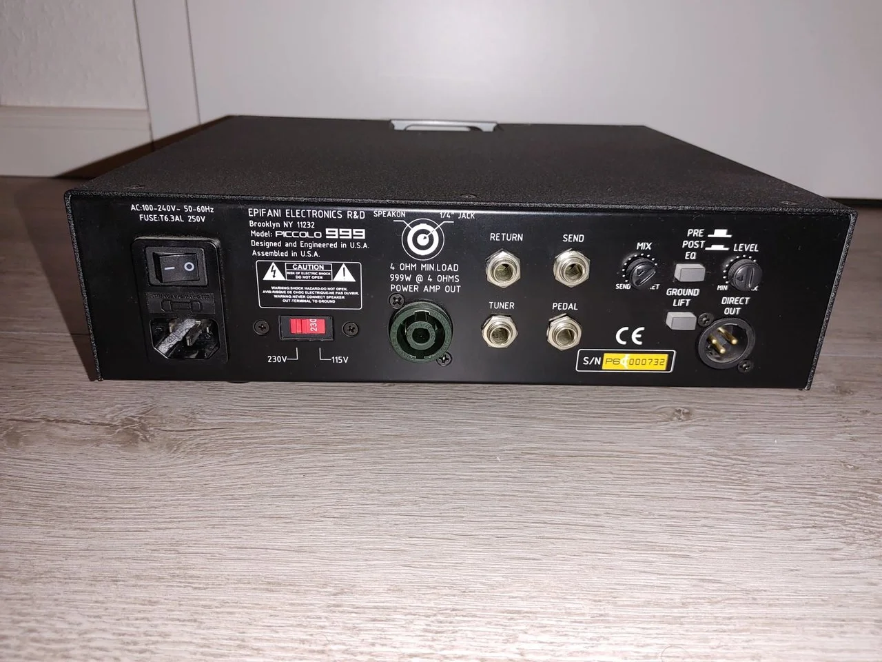 Vom Benutzer umschaltbar auf 115 Volt oder 230 Volt für internationale Reisen. Achtung! Wenn Sie die falsche Spannung einstellen, wird Ihr Piccolo beschädigt. Vergewissern Sie sich, dass Sie die richtige Einstellung gewählt haben, bevor Sie den Verstärker einschalten.