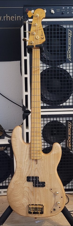 Gebaut hat den Bass ein Schweizer Bassbauer aus Basel, G. Nikolaiski. Da ich mit dem Hals nicht zufrieden war, habe ich mir von dem hier bestens bekannten Knut Reiter einen seiner typischen Preci-Hälse bauen lassen - kräftig, kerzengerade, steht wie eine Mauer. Es waren also zwei Bassbauer beteiligt, deswegen "Hybrid"........Schweizer Body, Bergischer Hals.....