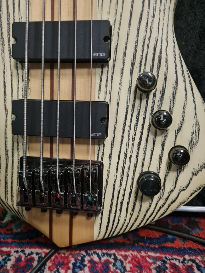 Noch alles Original, nix verbastelt. 2 x EMG DC40, Esh custom Piezo und Eshtronic, Schaller Hardware, Graphtech Sattel mit 46,3 mm.