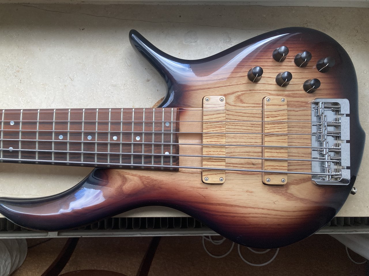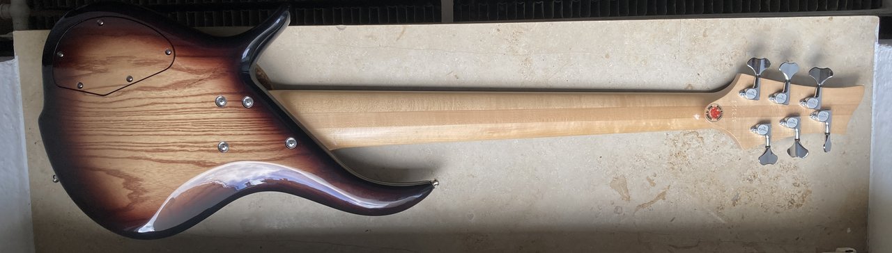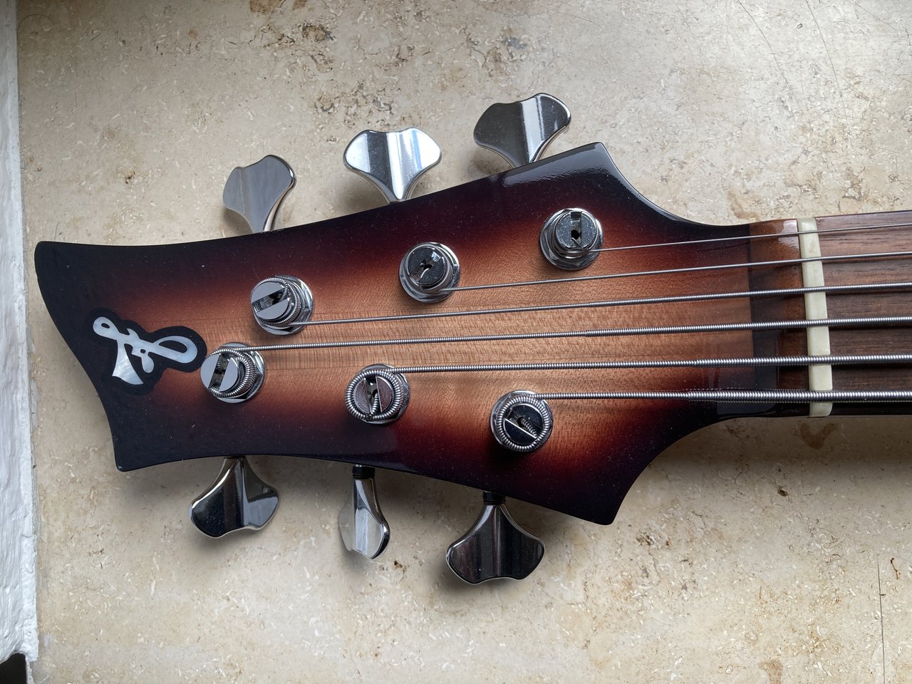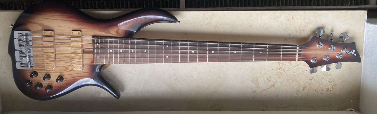 Das Instrument ist in einem super Zustand, hier und da ein paar Kratzerchen, aber nichts, was auffällig ist. Dabei ist noch ein Gigbag von F-Bass, bei dem ein Gurt bereits gerissen ist und mit Gaffa repariert wurde, nicht schön, aber für den Versand völlig ausreichend.