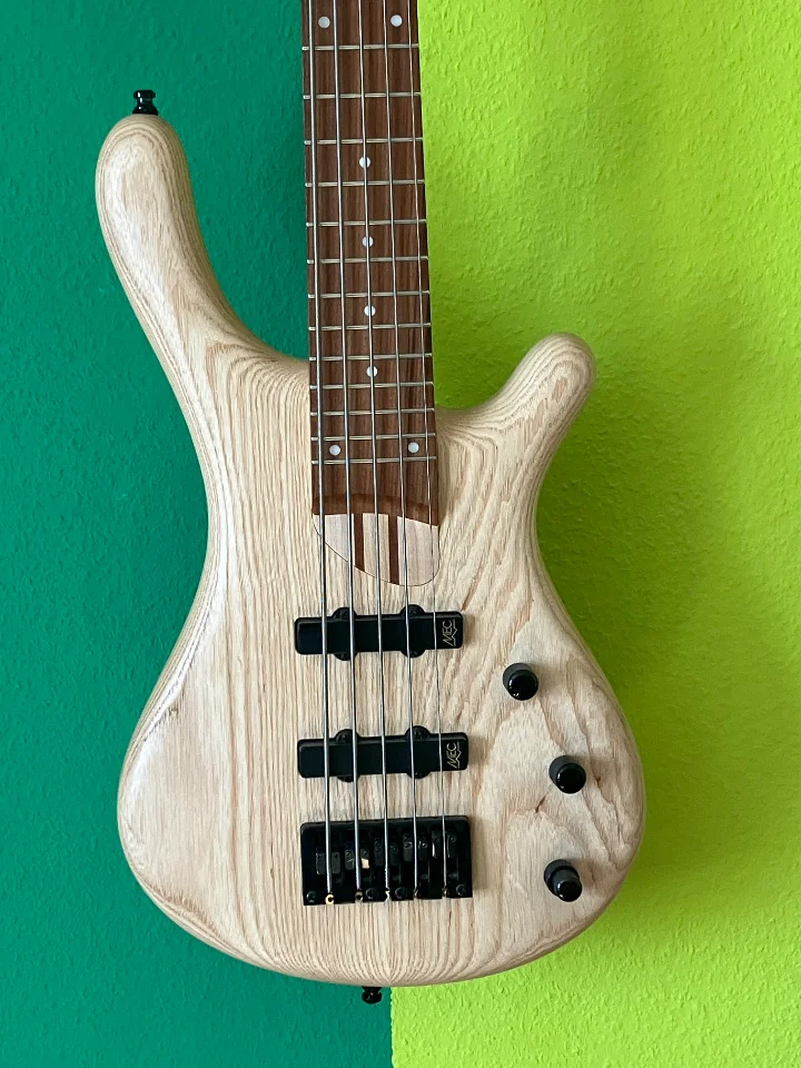 trenne ich vom meinen“Bestands-Bässen“. Hier von meinem Fame Baphomet Ash 5 Saiter. Der Bass kommt inkl. Gigbag.