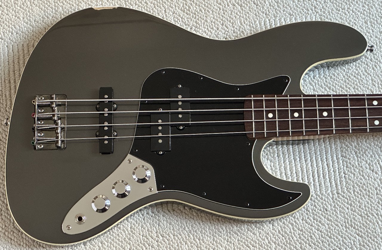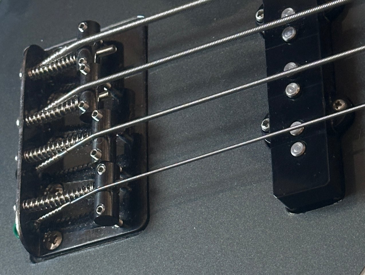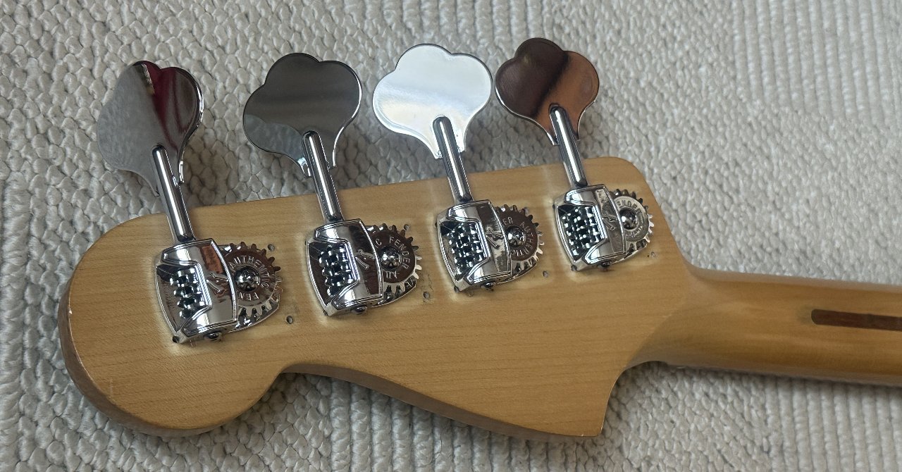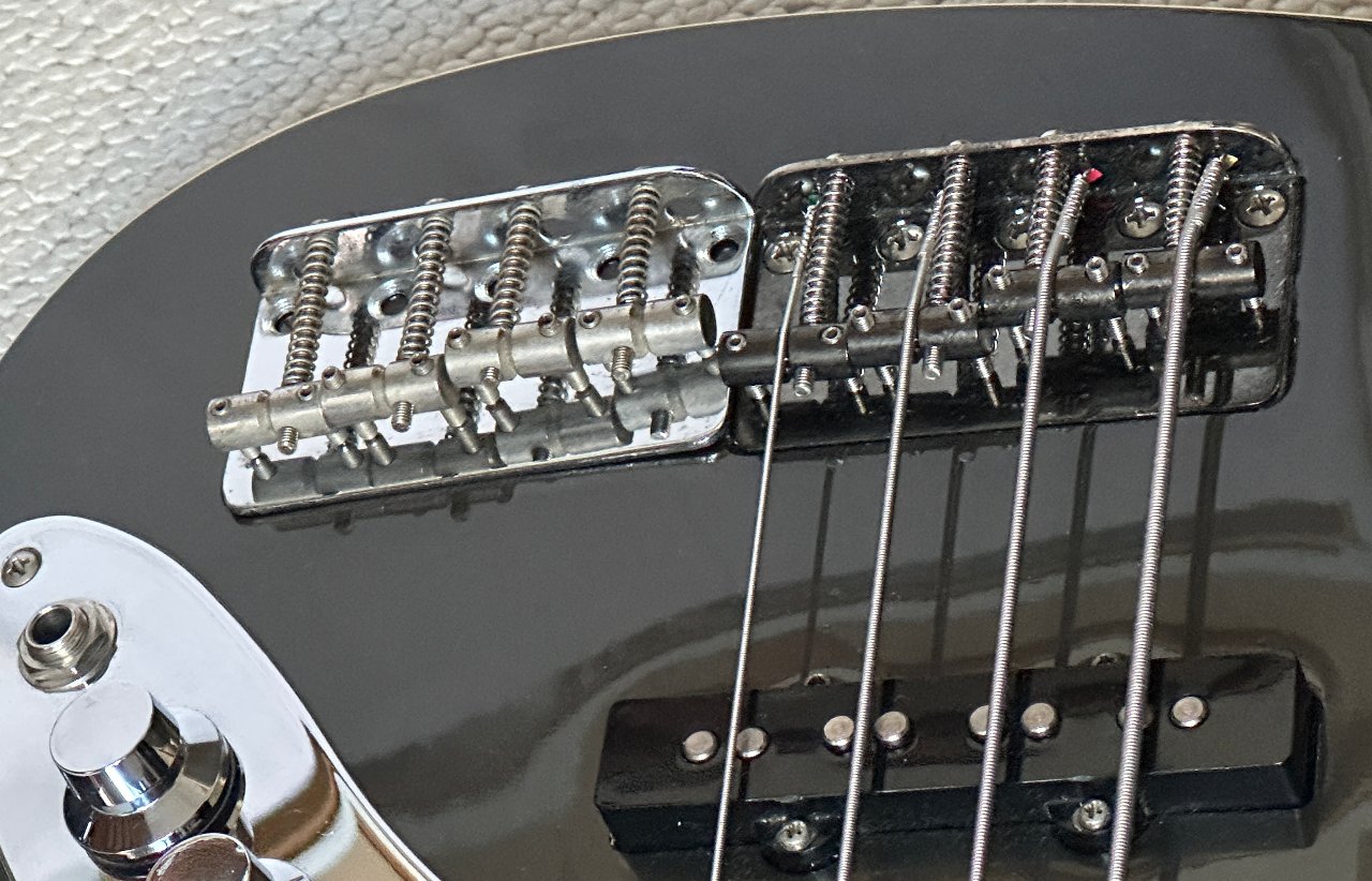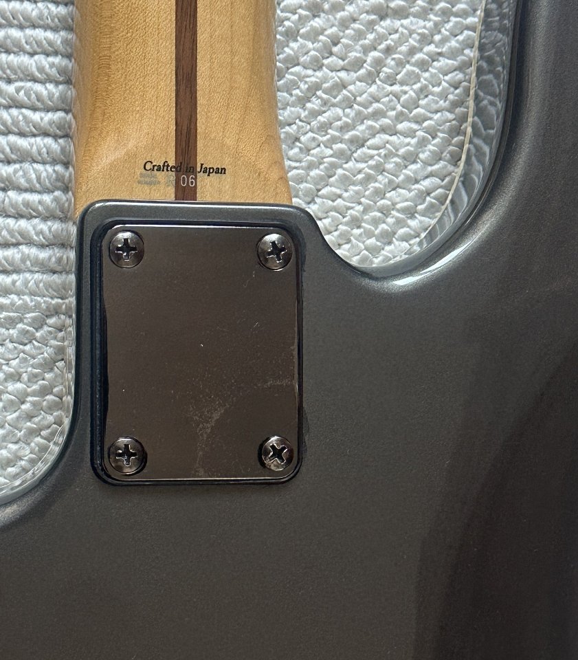 Er hat statt der einfachen Mechaniken die leichten Fender Deluxe Mechaniken bekommen. Die silberne Bridge wurde aus optischen Gründen gegen eine schwarze Fender Aerodyne Bridge (black nickel) getauscht, die nur bei den schwarzen Bässen verbaut waren. Sie ist etwas in den Korpus vertieft eingelassen, daher passen da größere Brücken oder z.B. eine HiMass nicht. Die Halsplatte ist in der gleichen Farbe wie die Brücke mit den passenden schwarzen Schrauben.