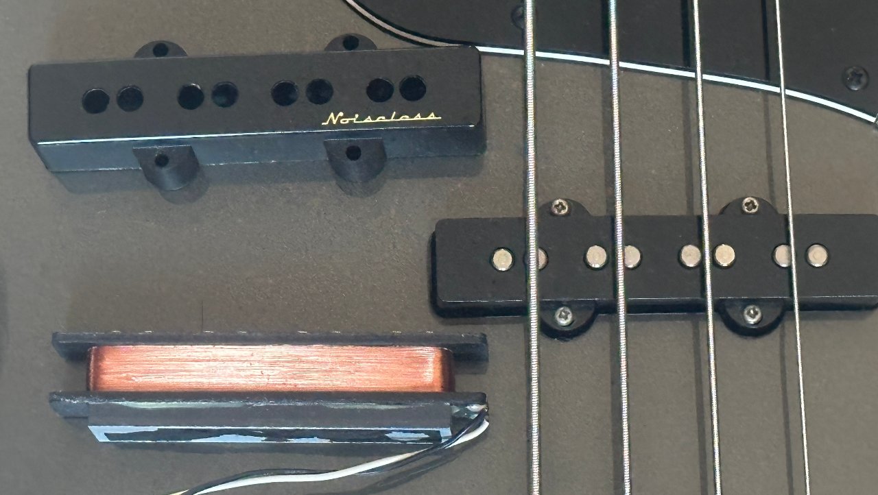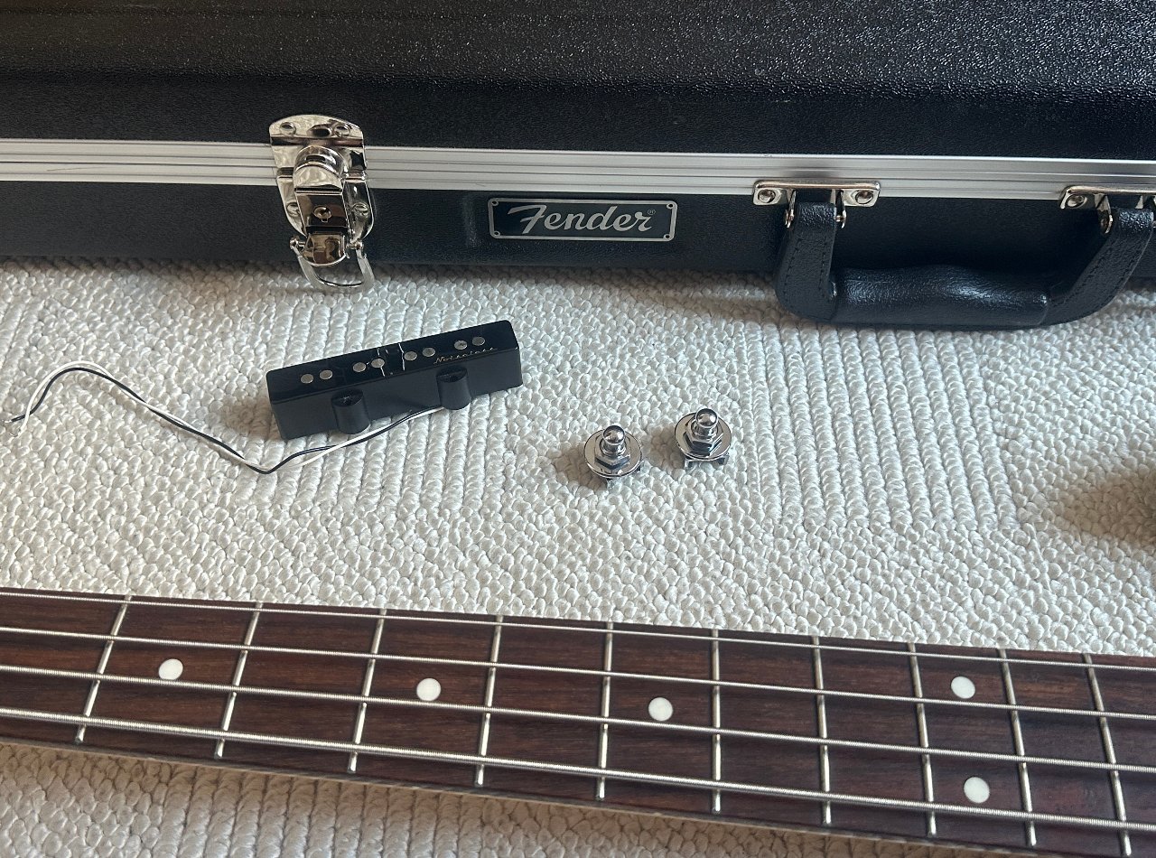 Er hat eine PJ-Bestückung mit dem Split-Coil in der Halsposition und einem Single-Coil an der Bridgeposition. Der Single-Coil an der Bridgeposition ist gegen einen Fender Vintage Noisless Pickup getauscht worden, die originale Kappe ohne die Beschriftung ist aber darauf. Der originale Pickup ist mit im Lieferumfang dabei.