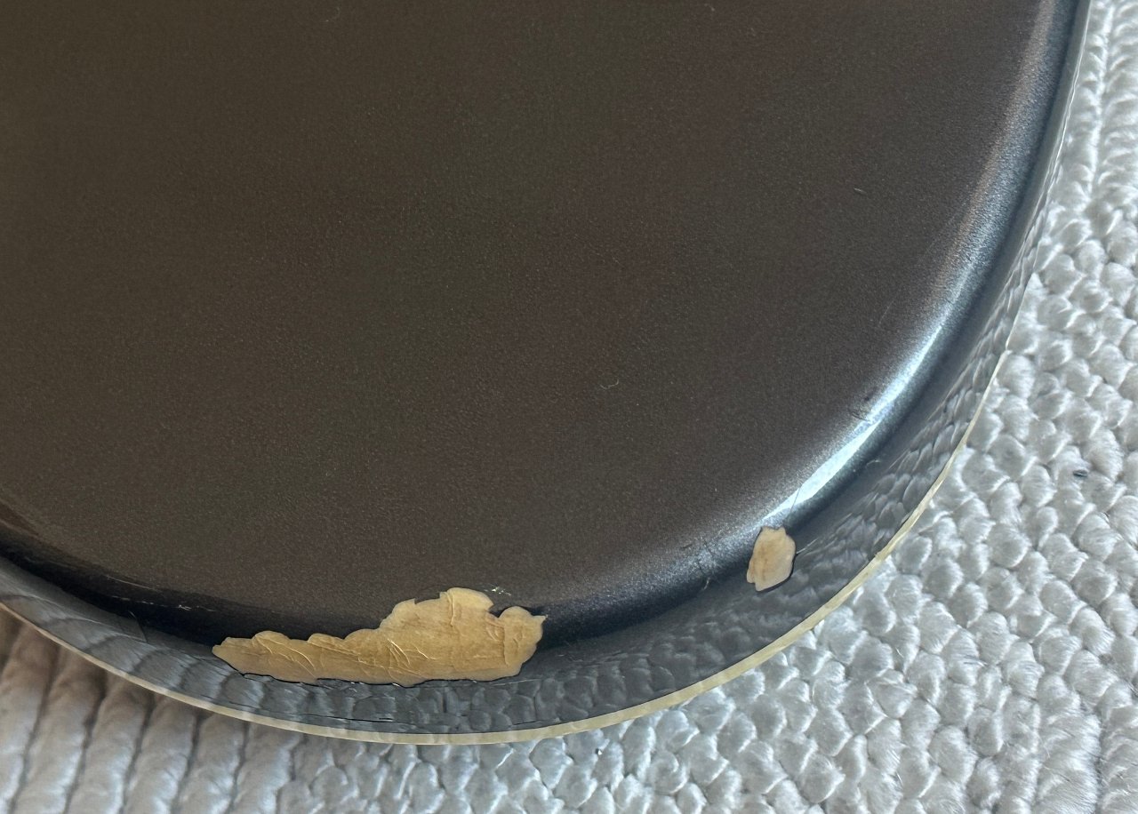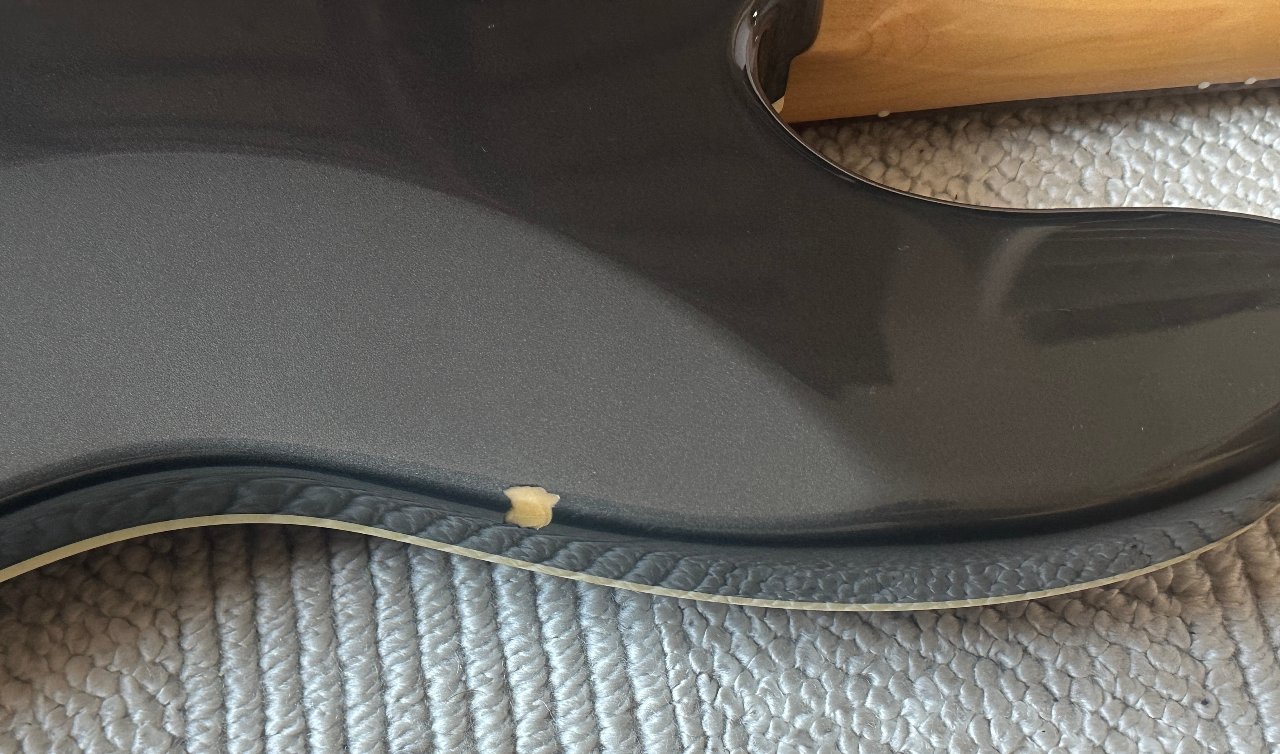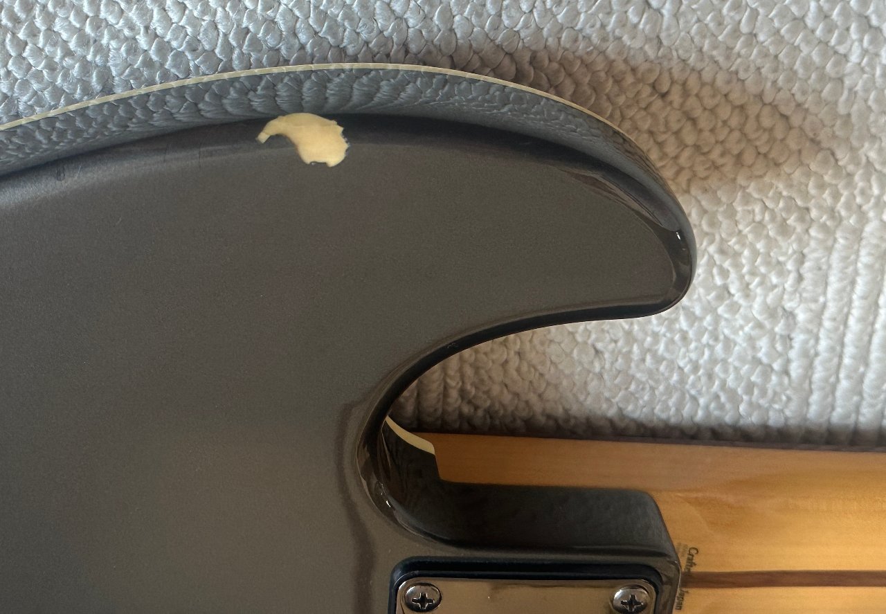 Er hat mehrere Lackschäden (siehe Fotos) und ein paar Kratzer, besonders fällt die abgebissene Ecke an der oberen Korpuskante und die kleinere Knabberstelle an der Kopfplatte auf - er wurde halt gespielt und war kein Wandhänger. Schon der Vorbesitzer hatte ihn auf vielen Bühnen mit dabei. An den Bünden sieht man nur minimalen Verschleiß und es sind alle Lagen gut spielbar. Er wiegt ca. 4 kg.