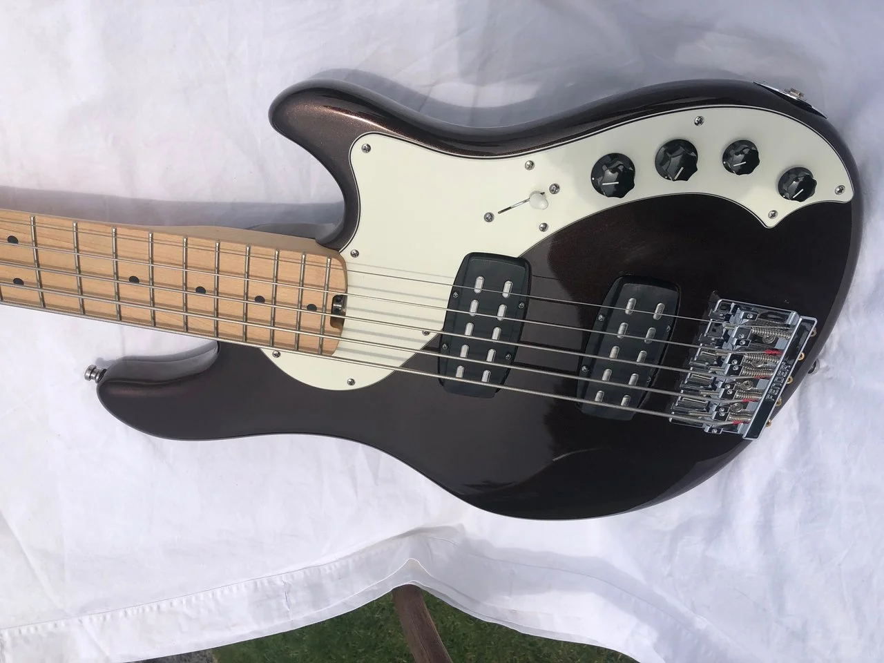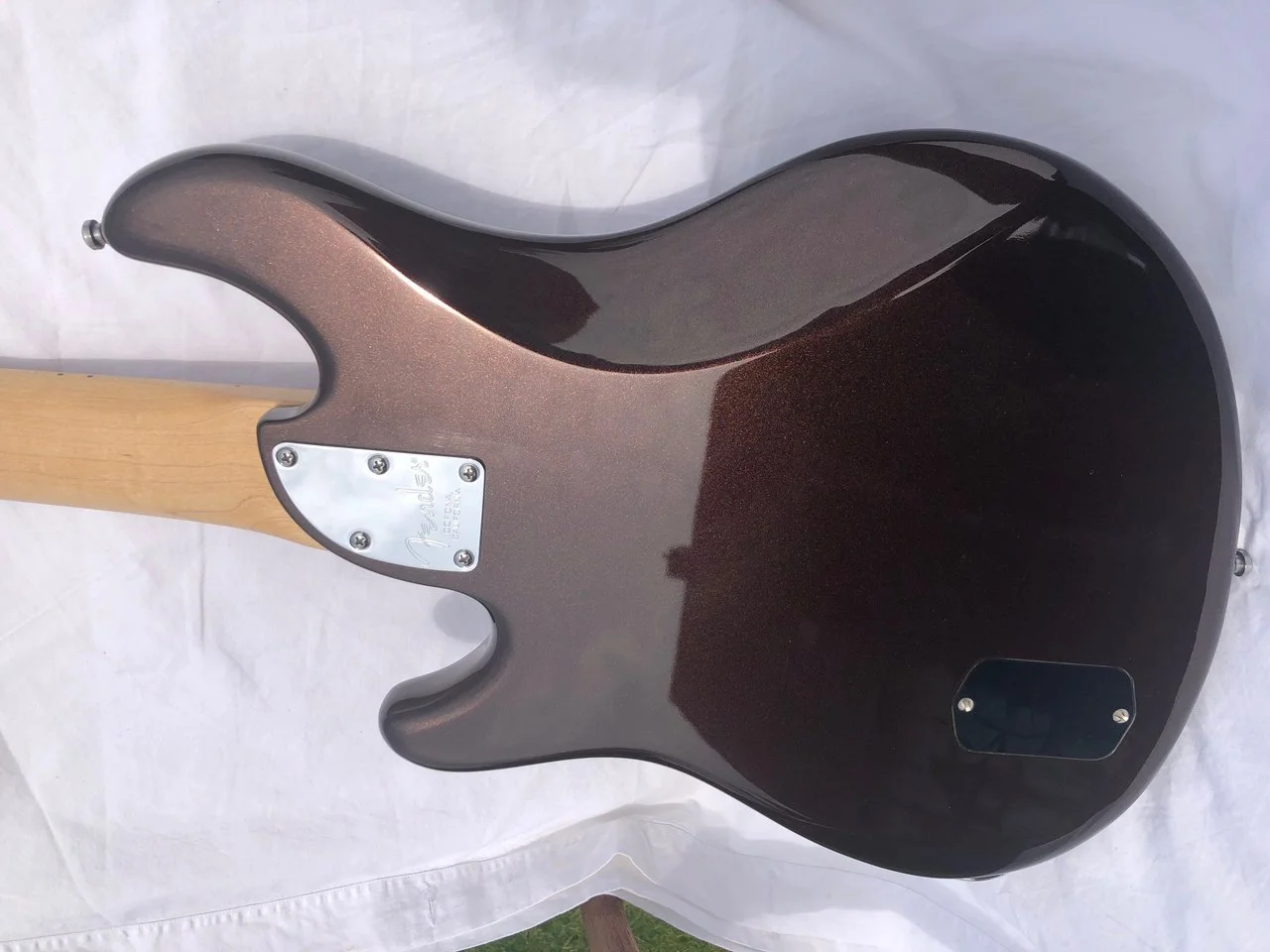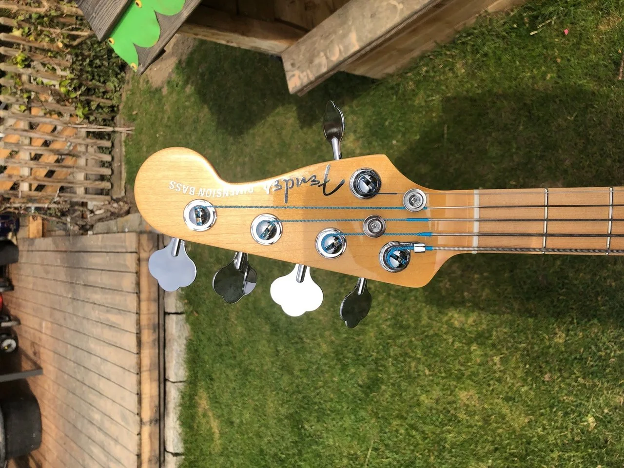 fender dimension 5 american deluxe FIVE in rootbeer (schöne farbe, sehr dunkles fast schwarzes braun wie GUINNESSbeer, mit ganz leichtem metallicschimmer wenn licht drauffällt) verkaufen. getrimmt von christoph dolf , innen komplett mit kupfer ausgekleidet, da ein ganz leichtes brummen zu verzeichnen, war - live hätte das nicht gestört - der bass wurde von mir nur im heimstudio verwendet, nun ist er absolut still.